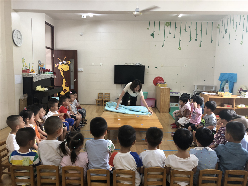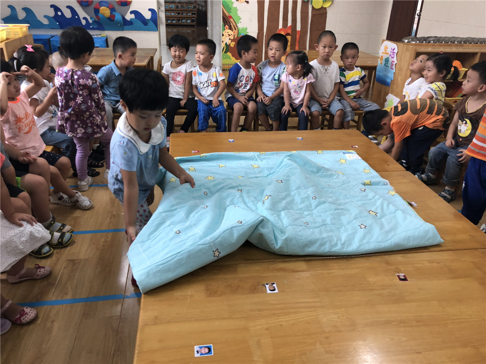 “老师说要把被子铺开,四个小角对在一起。”