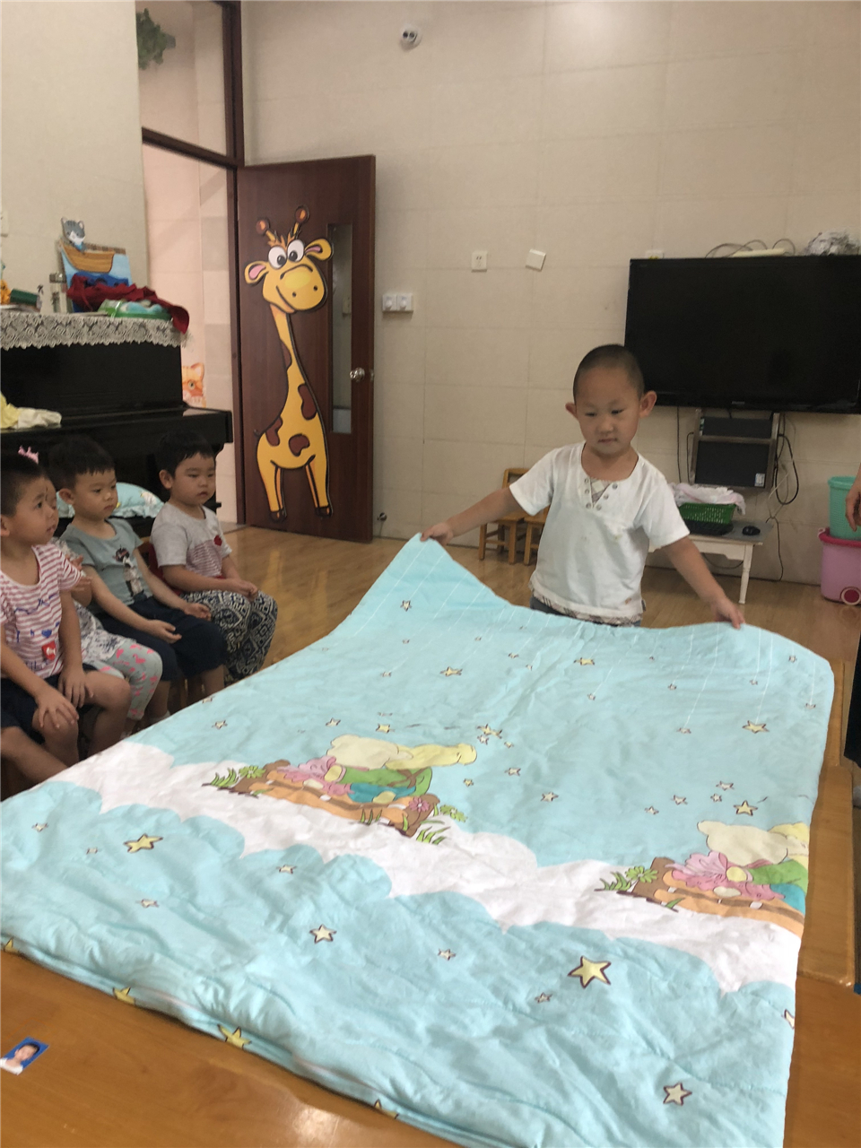 “耶!被子叠好啦!”