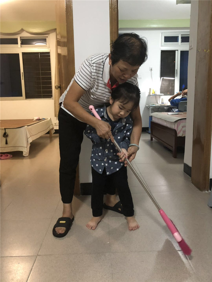 “我帮奶奶扫地板,虽然还没有扫把高但我很认真哦。”
