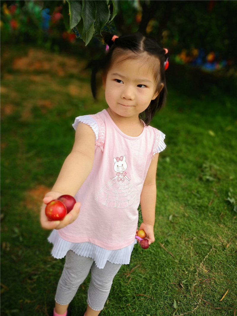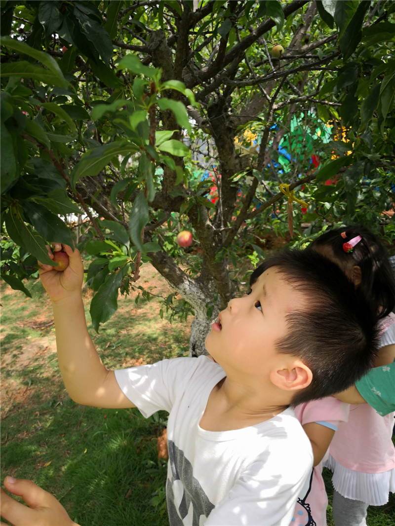 “咦?这棵树有点眼熟啊?”老师故意绕着树走了一圈。“哎哟~郑老师,这就是我们上次摘李子的那棵树嘛!”萱萱一脸嫌弃地说。萱萱一说完,航航提出了疑惑:“可是我们上次摘的李子是绿色的啊,和这个不一样啊。”昊昊马上说:“对啊,对啊,它们的颜色不一样。”萱萱像大姐姐一样解释道:“上次的是这么小,是小李子。小李子长大了嘛,就像我们会长高一样啊。”“上次我们吃的绿色的酸酸的,应该是小李子还没有长大,等长大了应该就是现在这个样子了。”芮芮附和道。“那我们摘点回去尝尝呗。”小宝盯着果子笑眯眯地说。于是,大家七手八脚地摘起了李子。