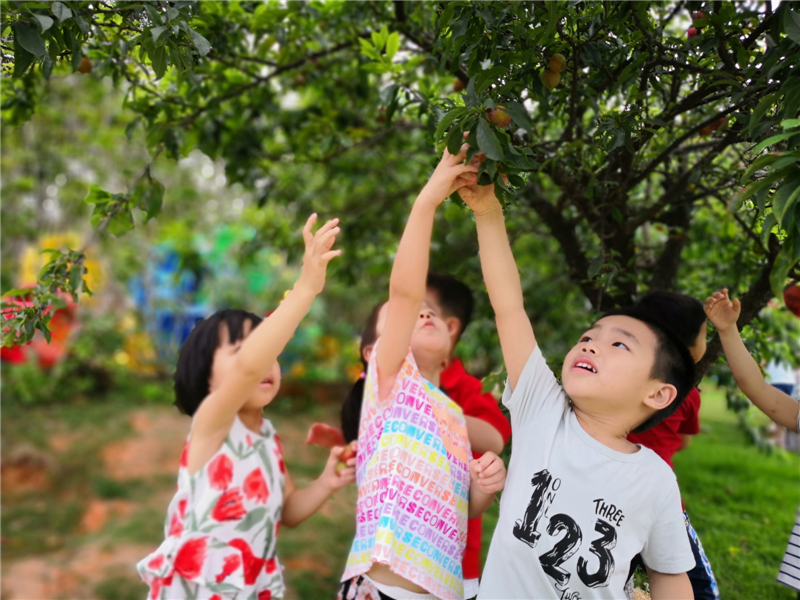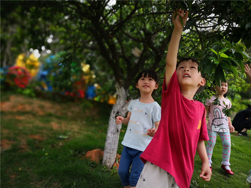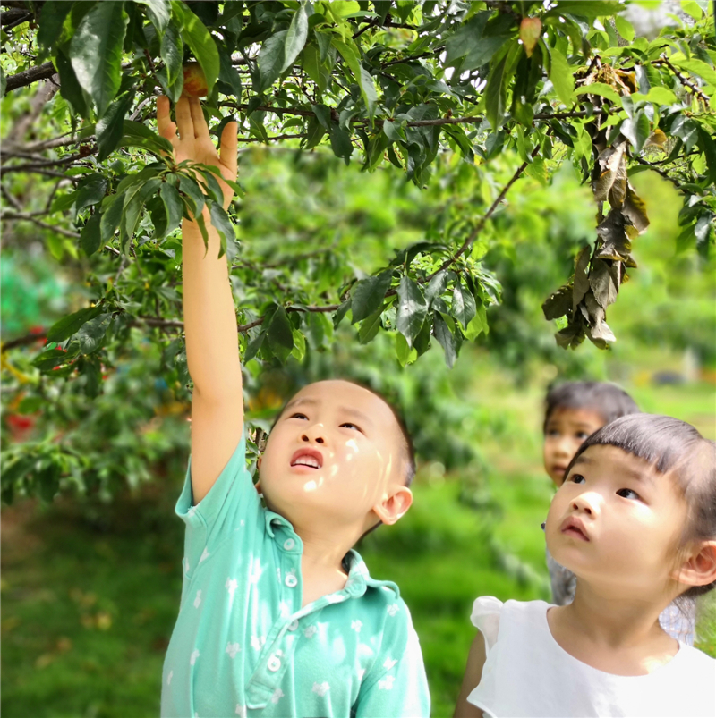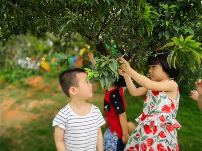 “快看,快看,那棵是什么树?树上好像有果子耶!”小宝发现了新大陆,兴奋地往前冲。“哇噻~真的耶!”爱起哄的娃们一窝蜂地跑了过去,围着果树研究了起来。