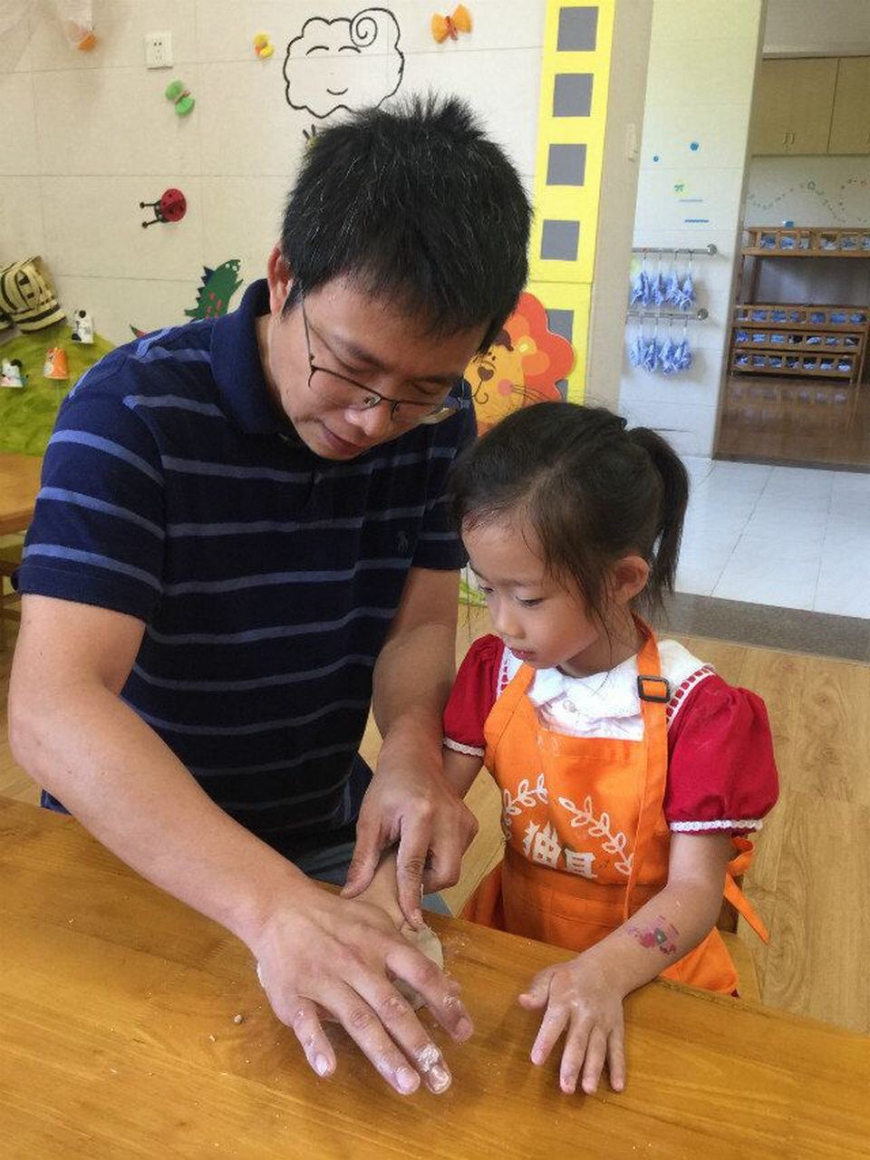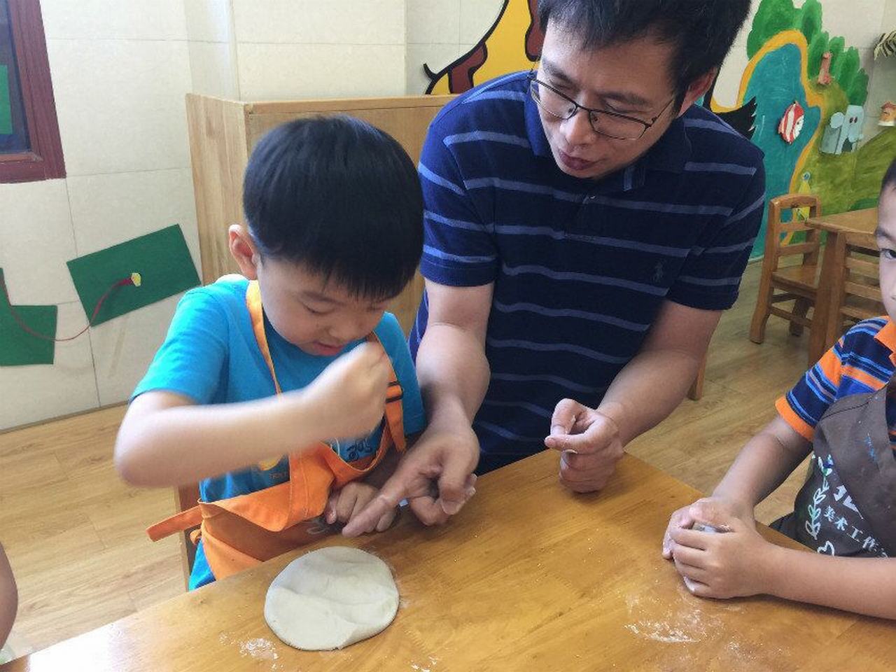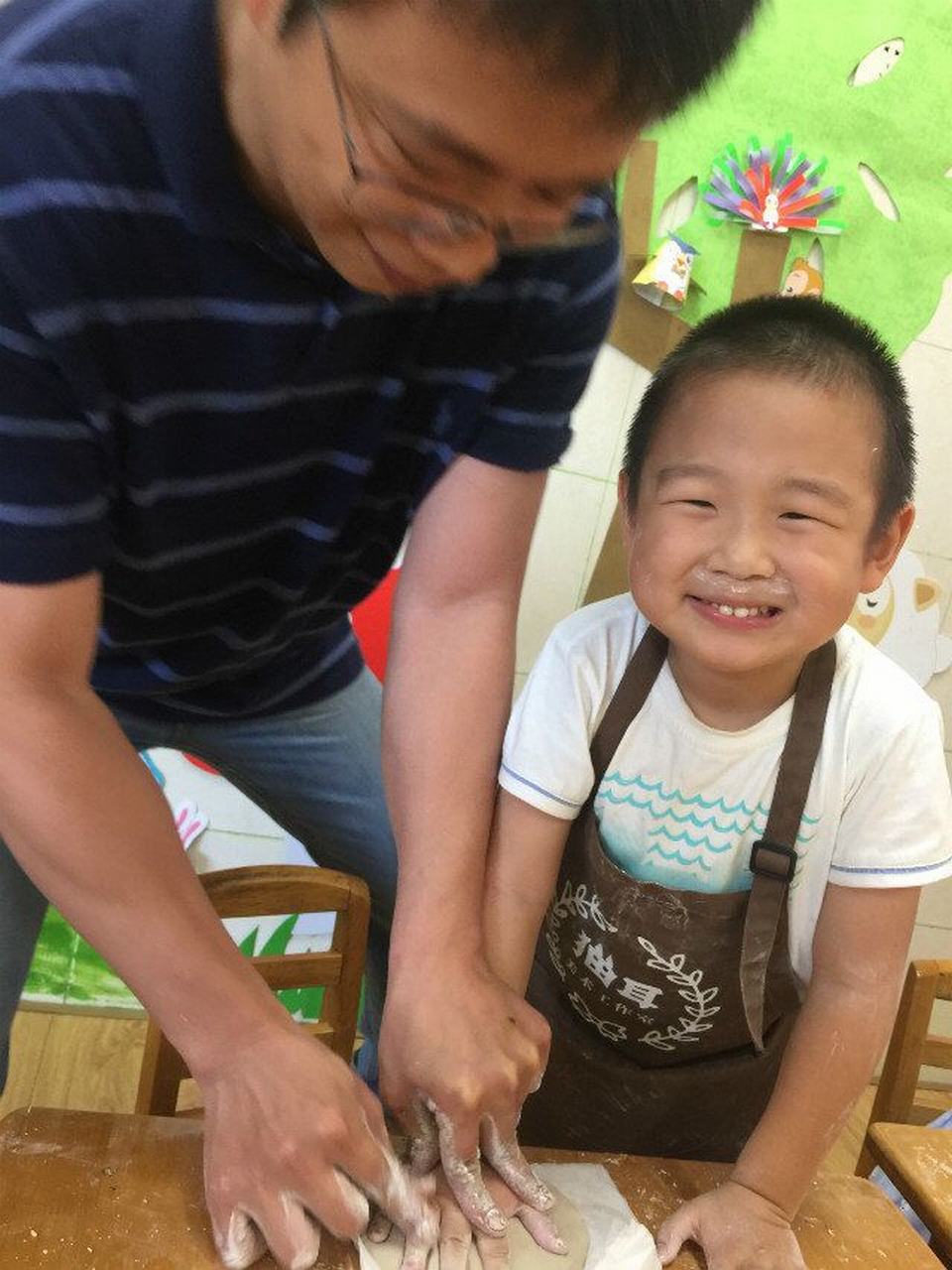 来给小朋友们上课的,就是刘简尔小朋友的爸爸,作为专业的儿童美术培训专家一出手就不同凡响!这次给小朋友们准备的是陶土泥塑。来来来,老师一起来帮忙,围裙围起来,准备开始啦!