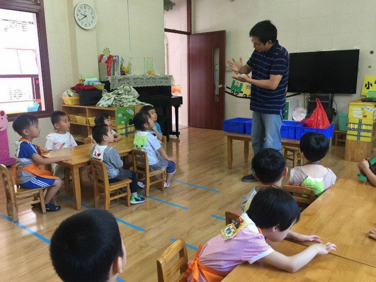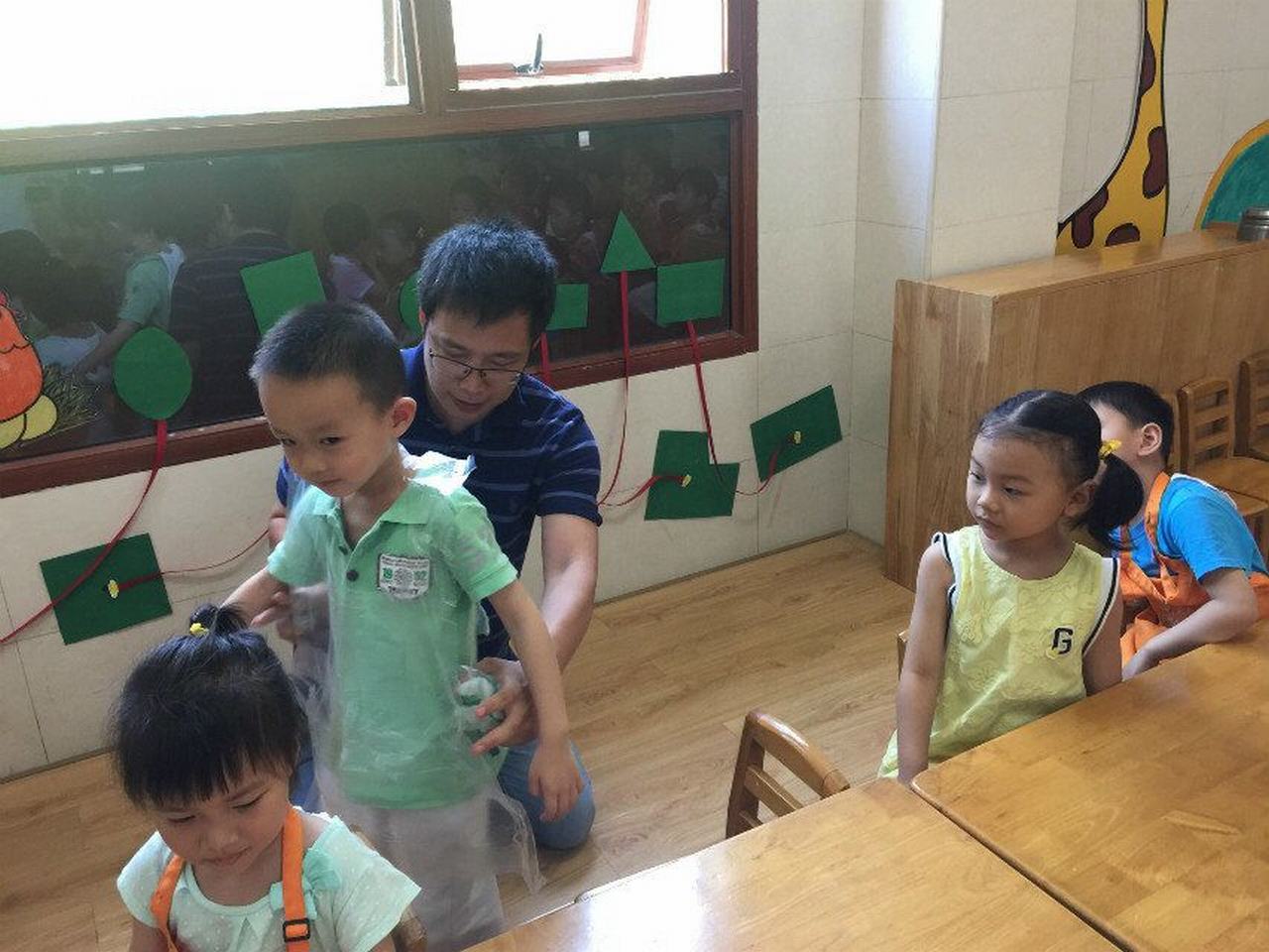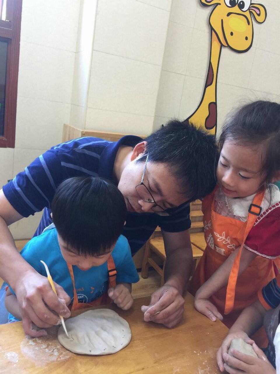 来给小朋友们上课的,就是刘简尔小朋友的爸爸,作为专业的儿童美术培训专家一出手就不同凡响!这次给小朋友们准备的是陶土泥塑。来来来,老师一起来帮忙,围裙围起来,准备开始啦!