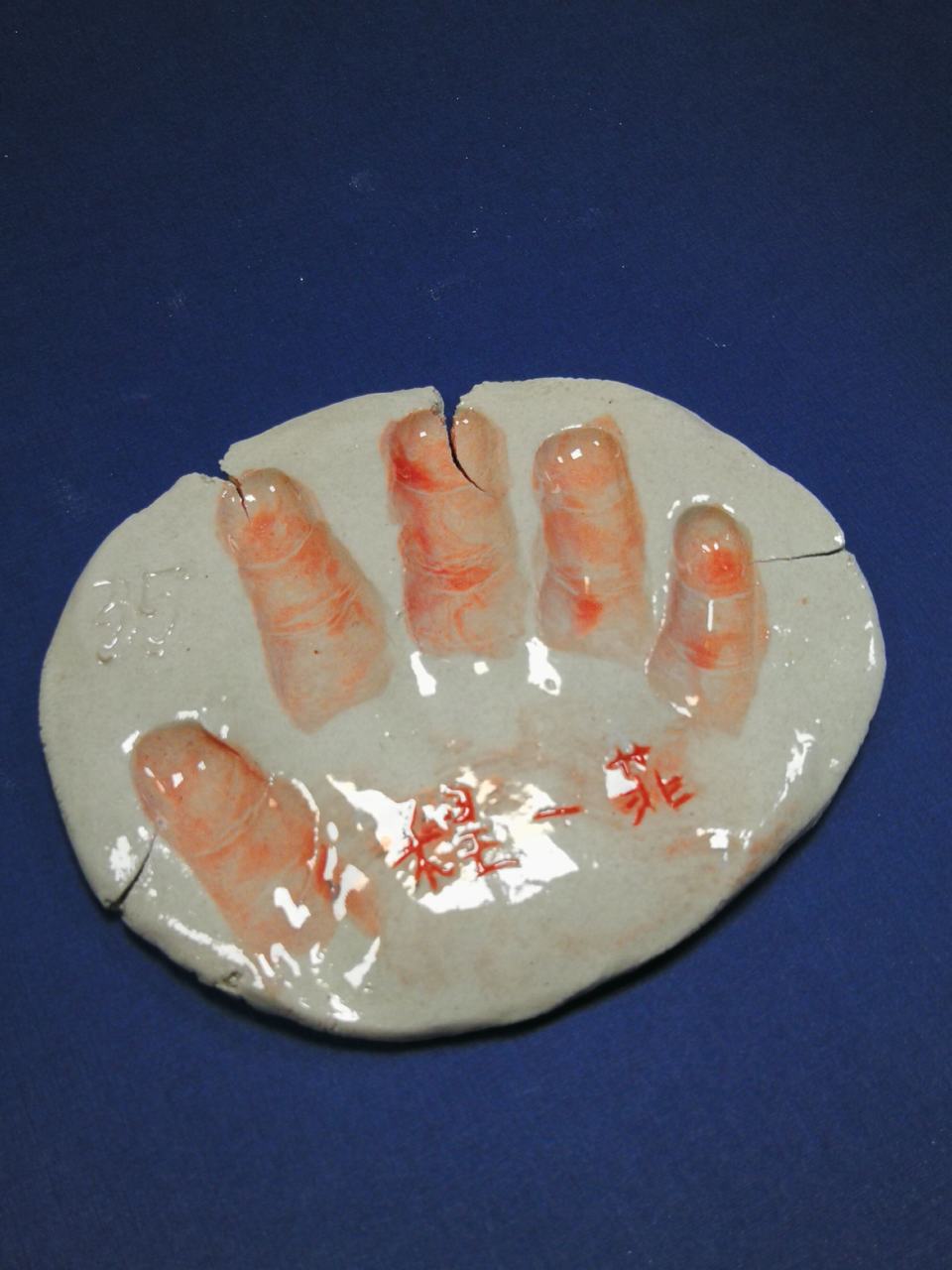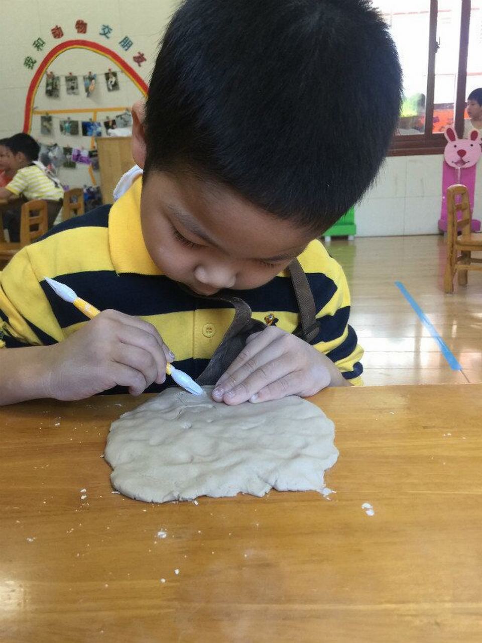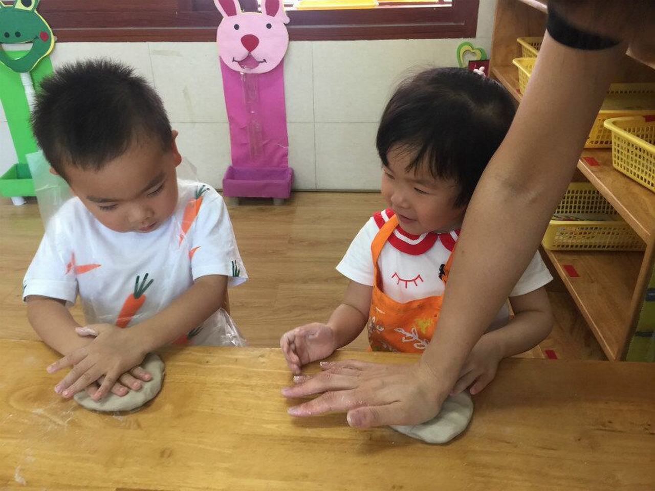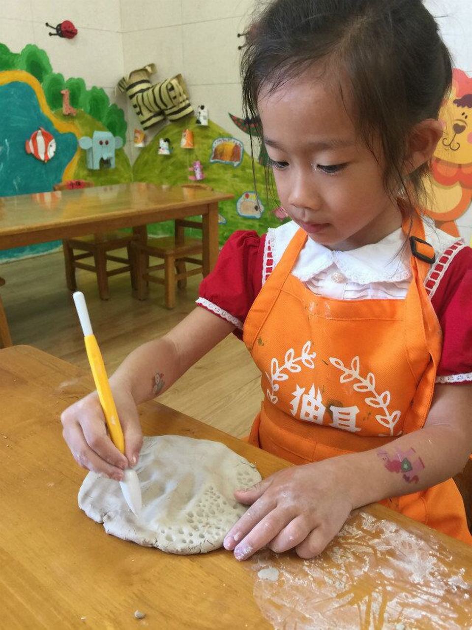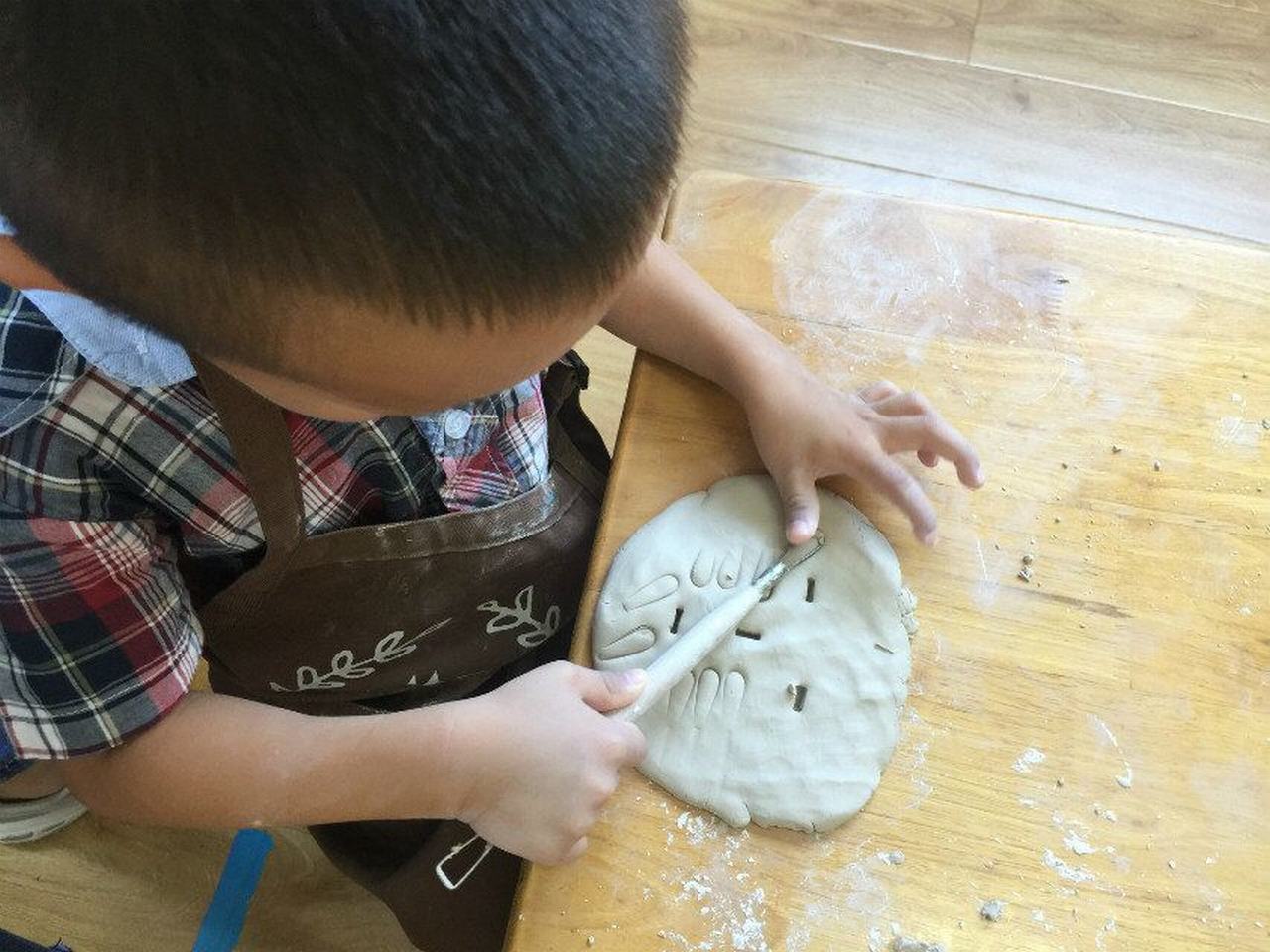 赶紧试一试吧!用自己的小手用力地搓圆、压扁、拍平......压上自己的手掌印,再用工具压上各种自己喜欢的图案。