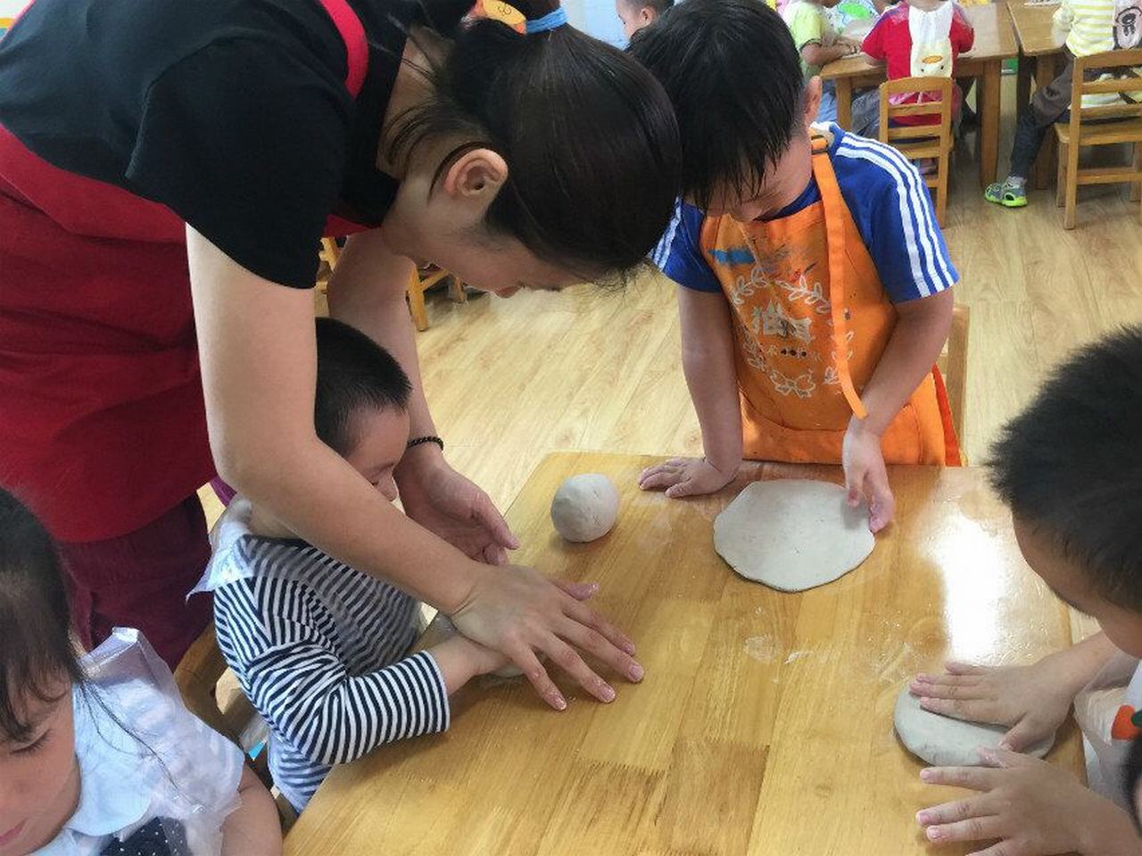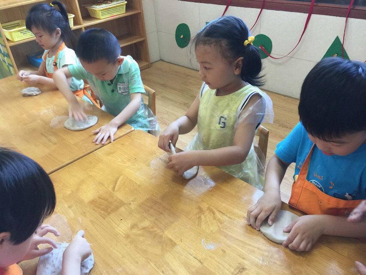 柳柳害羞地说:“我做了一只小鱼”,直直说:“这是我做的娃娃”,元宝乐呵呵地:“那我就是面包师傅!”“面包师傅,你都长白胡子啦!”……