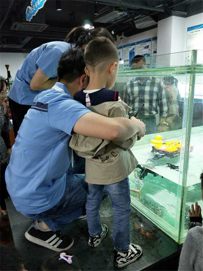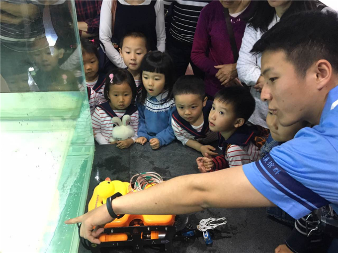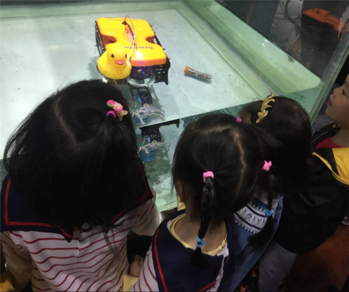 大家猜猜,这漂在水上的黄色壳子是什么?这就是神奇的水下机器人,在水中,它能像鱼儿一样,一会儿上浮,一会儿下沉,一会儿往,这一会儿往那,可灵活了!它的身上装着探照设备,可以把海底的景象拍出来,钳子还能准确地抓住想要的东西。热心的叔叔还教我们操作机器人,好是过瘾!