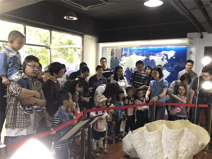 一走进博物馆,这巨大的贝壳吸引了我们的眼球,我们不禁惊叫起来。讲解员姐姐告诉我们,这叫“砗磲”,是海洋中最大的双壳贝类。它的外貌并不漂亮,但在海里张开贝壳时,体内色彩艳丽,不仅有孔雀蓝、粉红等各种颜色,而且还常有各色的花纹。