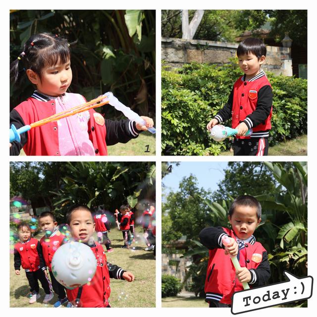 “哇,快看!小叶老师用泡泡枪吹吹了好多的漂亮的泡泡呀!”