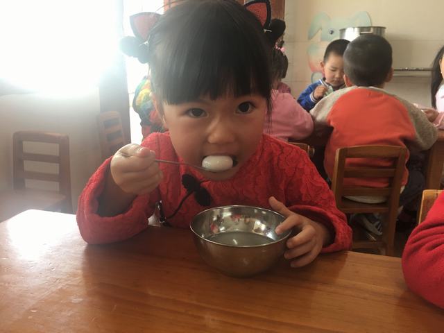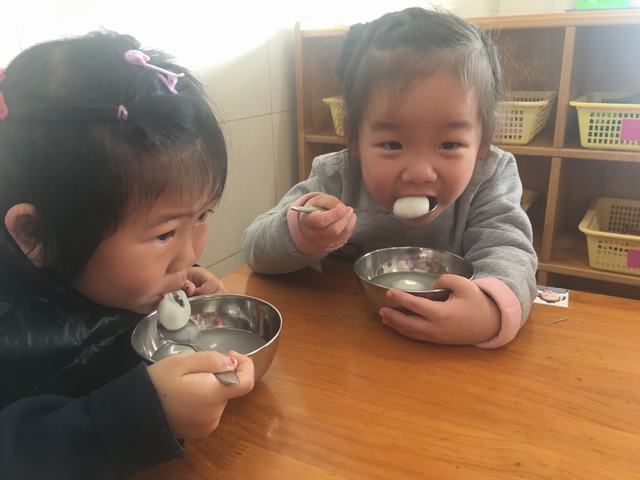 点心时间到啦,食堂叔叔阿姨们还给我们准备好了元宵汤圆呢!看着自己和同伴的碗里的元宵汤圆,孩子们兴奋极了,忍不住叽叽喳喳地讨论起来。