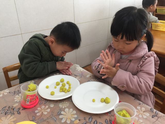 有孩子提议可以用橡皮泥做元宵!团圆,看上去简单,但对于小班的孩子们来说,做起来也有一定的难度。孩子们不怕困难,勇于挑战,看,他们用一双双能干的小手做出了一颗颗甜蜜的元宵。