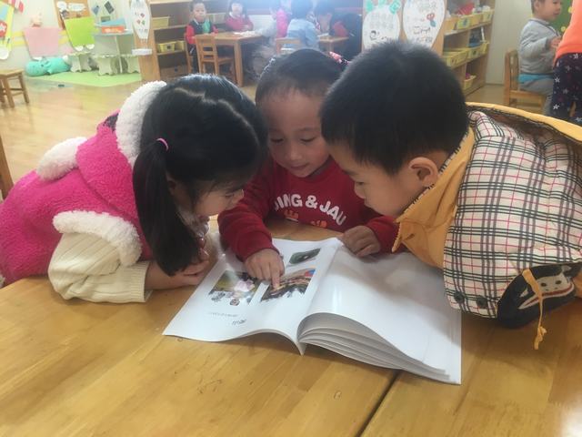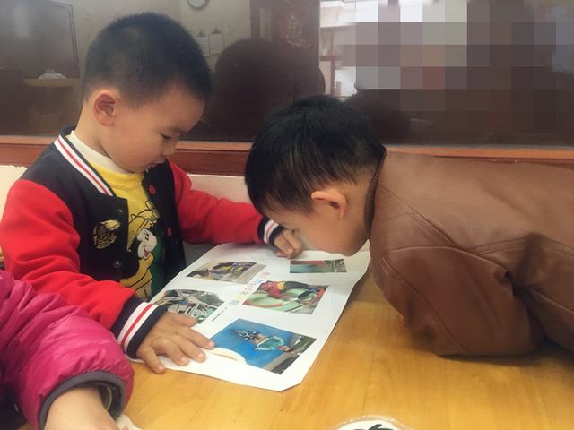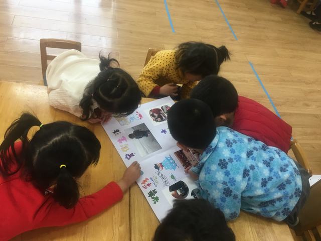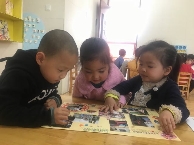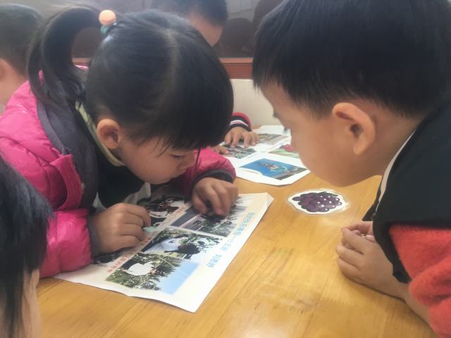 萌娃们围在一起看小伙伴的寒假欢乐的生活。