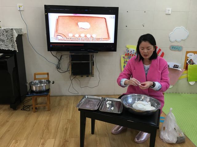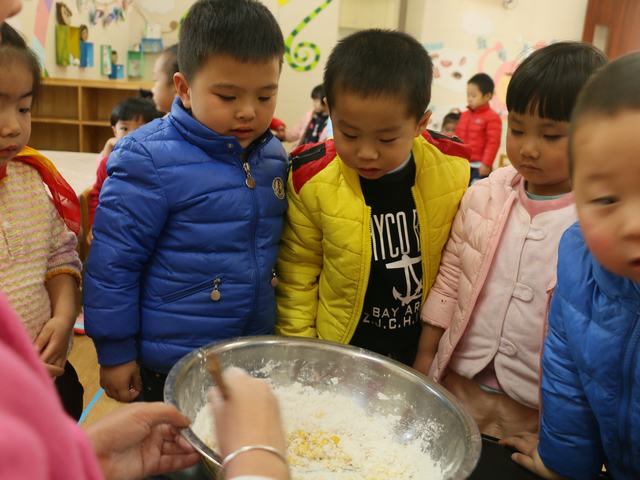 瞧,宝贝们看的多认真呀,糯米粉加水搅拌就可以开始准备搓汤圆啦。谁想来搓一个汤圆试试?“我来,我来”宝贝们都跃跃欲试,一个个期待的小眼神。