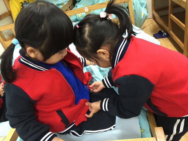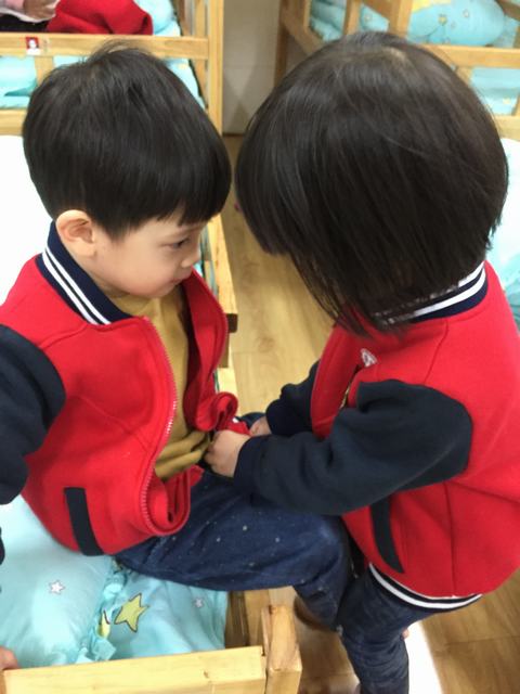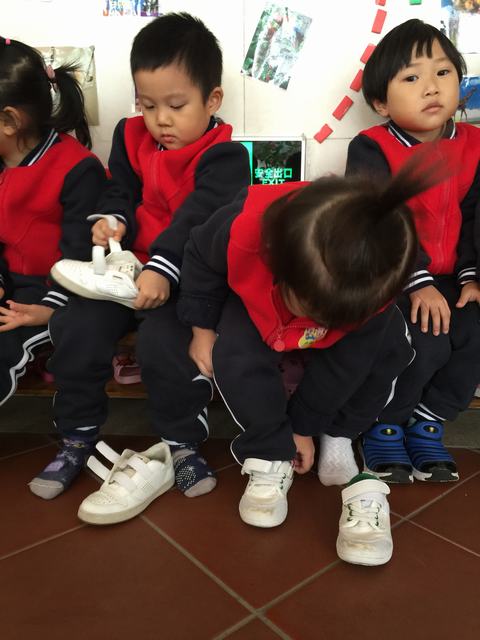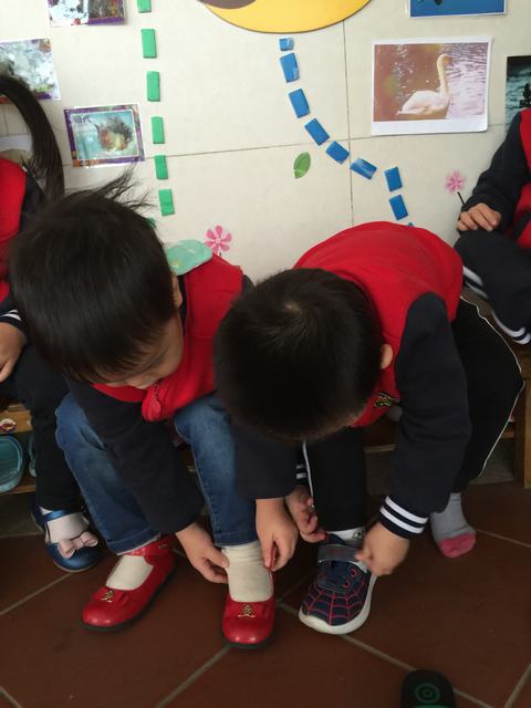 瞧!老师正认真地给小朋友梳头,大家积极地自己动手穿鞋子呢,棒极了!