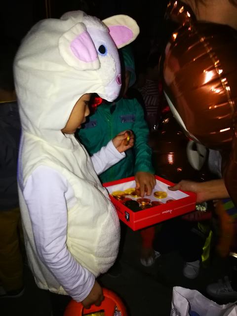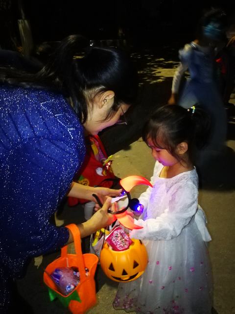 不过,打扮再奇特,大家似乎都有个共同的特点呢,那就是,所有人的目光都盯着——糖果!“不给糖,就捣蛋!”——别着急,别着急,每一个家庭的爸爸妈妈们早有准备,在自己家的门口准备了美味的糖果,等着开心的小宝贝:巧克力、牛奶糖、水果糖、棒棒糖…..种类丰富、好看美味。小朋友的眼睛都发亮啦,不过,我们小四班的孩子们还是很懂规矩的,每到一家发糖果的“驿站”,都拎着自己的小篮子乖乖滴排队一个个领取属于自己的小糖果,并且礼貌地说“谢谢”。任何时候,基本礼仪不能忘嘛!串了门、领了糖果,孩子们互相看着、一路笑着、闹着,海滨东区沿路洋溢着孩子们天使般的笑声……