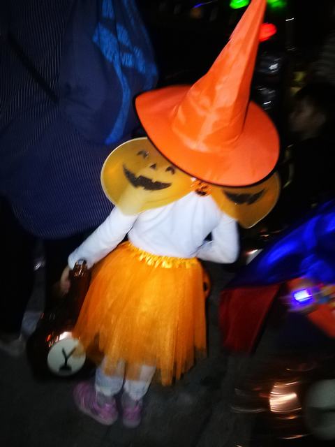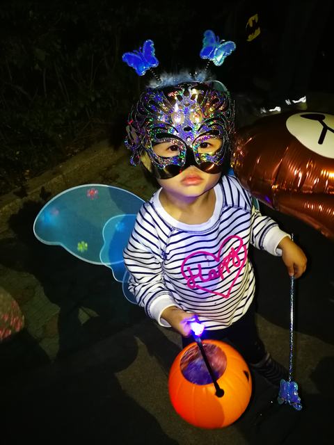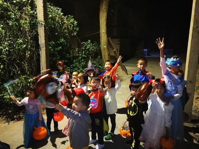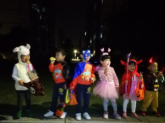 夜幕降临,小家伙们出动啦!瞧他们的打扮,庭依、朱莉装扮成美丽的小仙子,带着恶魔角的“小怪兽”就是柳柳和一菲啦,双胞胎兄弟披着披风变身为神气的超人兄弟!悠悠和宁宁呢,带着色彩鲜艳的巫师尖尖帽子。还有,可爱的羊咩咩,厉害的超人……真是百花齐放、奇形怪状的一个团队啊!