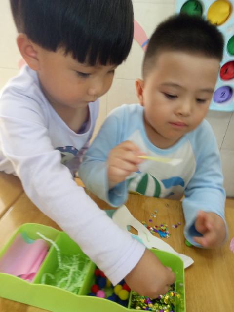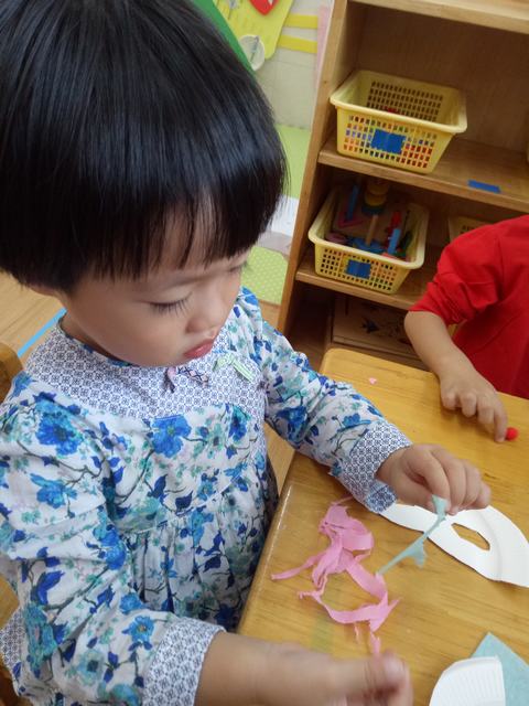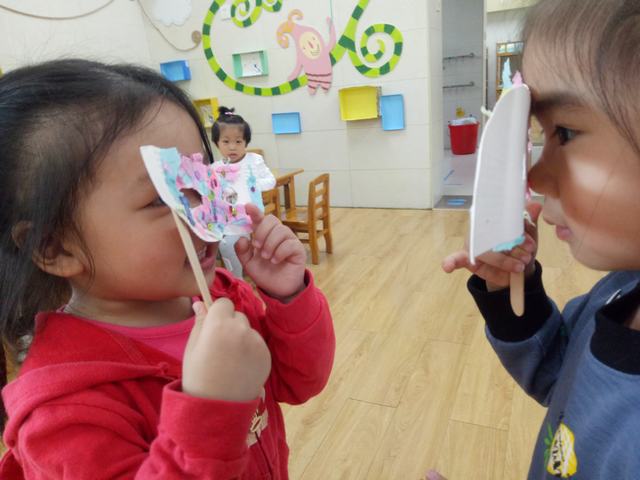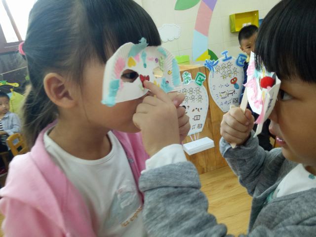 不一会有的小朋友就完工了,拿起面具玩了起来。