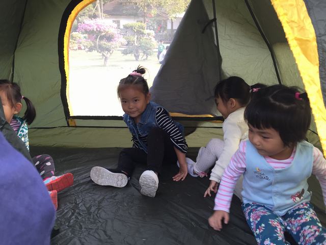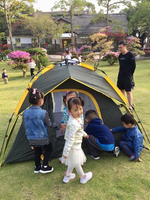 终于,帐篷的支架固定好了,娃娃们迫不及待地钻了进去,还把小帘子拉了起来,窝在他们自己的小天地里,开心地不得了。在里面呆腻了,就跑出来扮起了大灰狼,吓得帐篷的娃娃们赶紧关上了门。