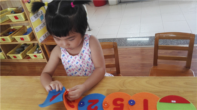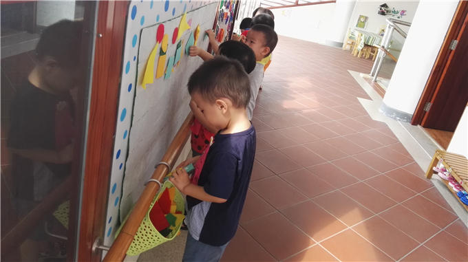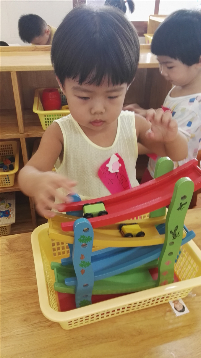 区域活动,这是萌娃们最喜爱的活动哦!手环放放好,区域活动开始啦!瞧!这个滚轮车可有意思啦!放上去就咕噜咕噜地滚下来啦!小毛毛虫扣起来,12345,真棒!我扣好啦!廊道的磁力片和魔术贴图形也很神奇哦,可以拼搭出很多东西哦!