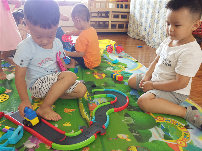 当然,还有我们的建构小天地,在这里我们可以尽情拼搭哦!瞧!这是我们拼的马路,小汽车正在上面开哦!还有,这是我拼的小花,漂亮吗?