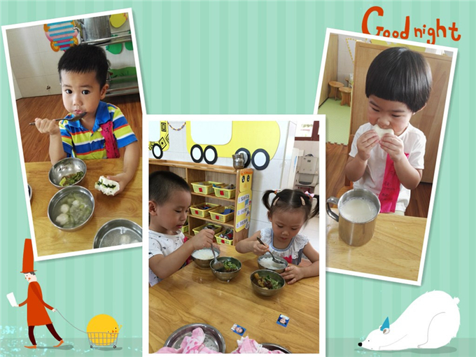 幼儿园里的饭菜真香呀!我会自己吃得干干净净哦!