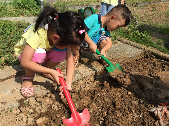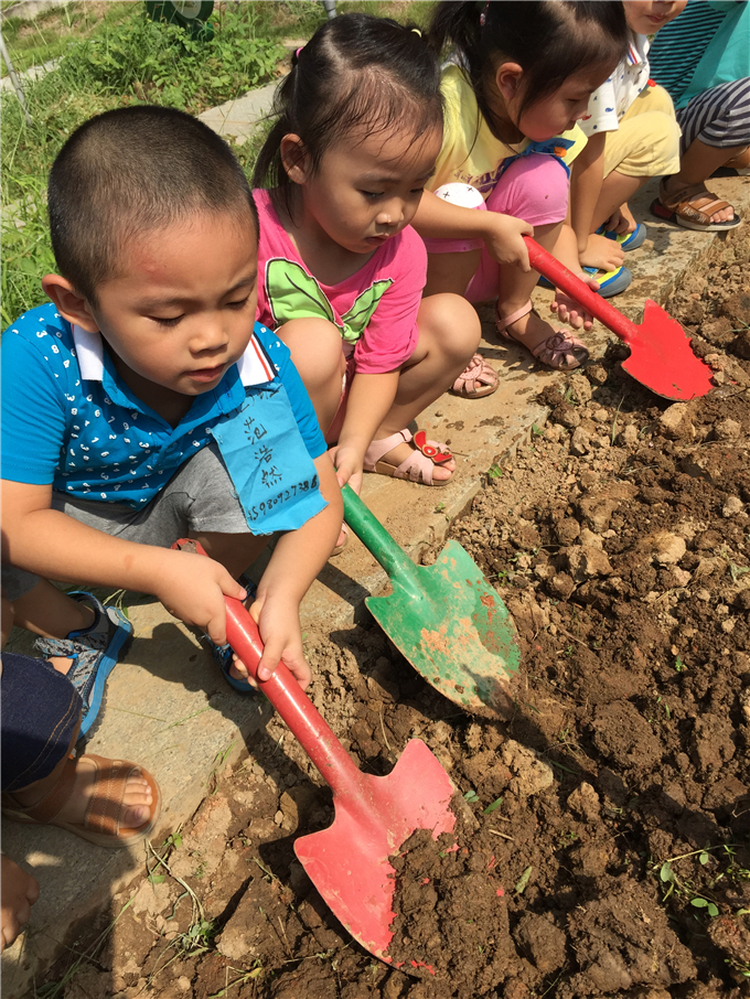 小朋友们拿起小铲子,当起了小农夫,挖土、铲土、松土、拍土 ……在老师的提醒下,大家一起你帮我来我帮你,乐趣可多了!