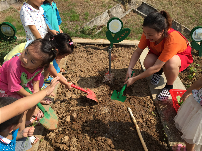 经过大家的努力,不一会功夫,菜地就整理好啦!看!老师正耐心地手把手教我们种植小菜苗呢!挖个小洞洞,小菜苗轻轻放,泥土细细埋,菜苗种种好。今儿我们又学了个新本领,真是太棒了!