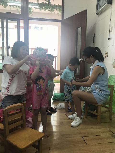 哇!可要感谢班级的志愿者妈妈帮忙给小朋友们换衣服哦!