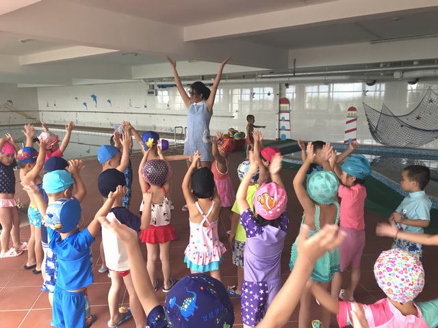 下水前,可要认真跟老师做做热身运动哦!小手举高高!“一二三四五六七八,二二三四五六七八……”