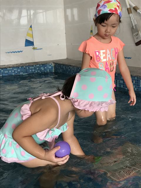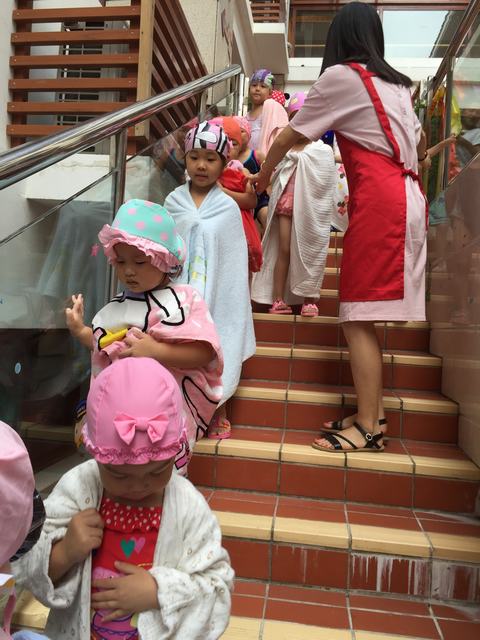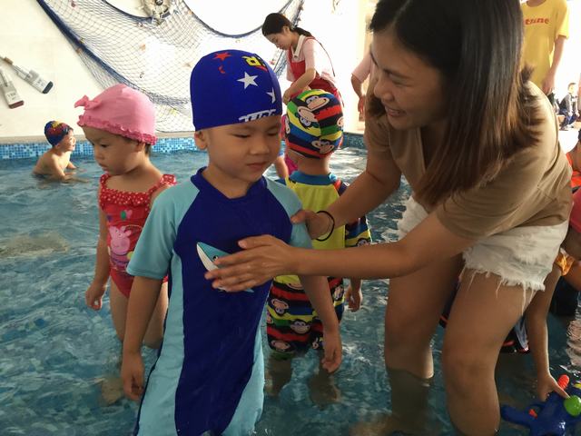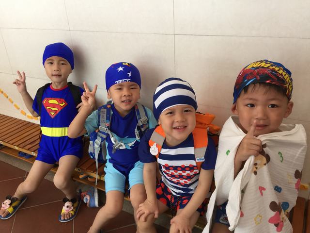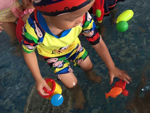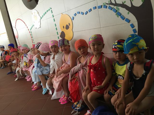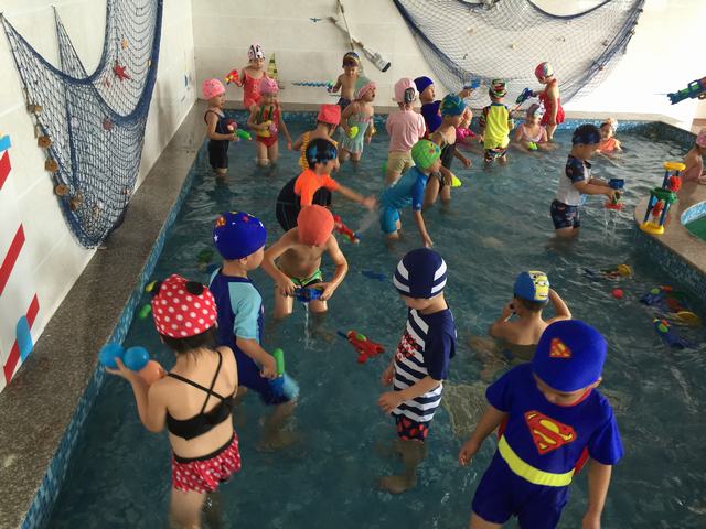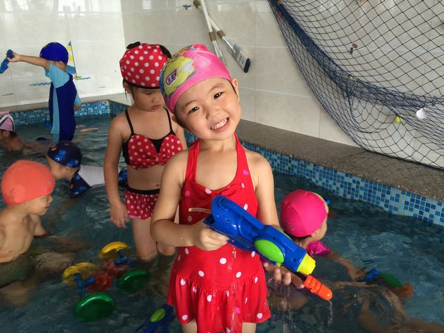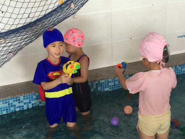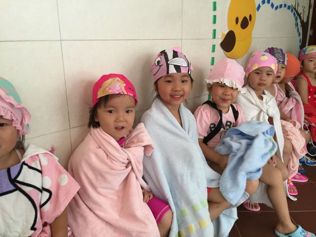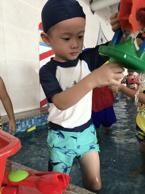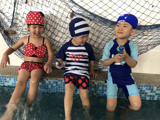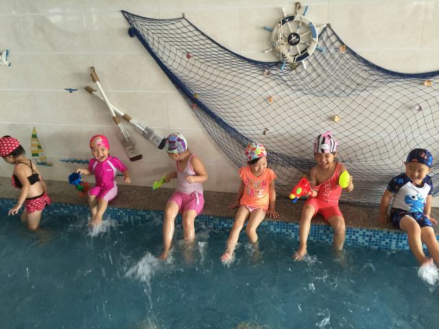 第一次踏入幼儿园的戏水池,水暖暖的,好舒服呀,细心的老师教我们用水拍拍胸脯预热一下。