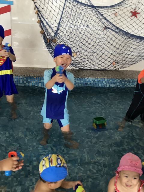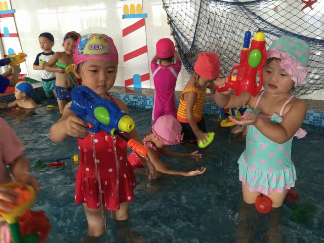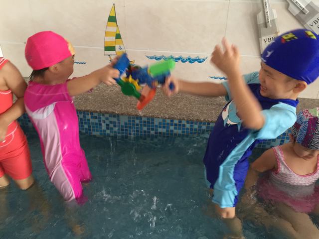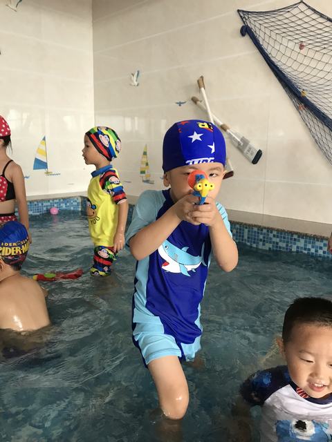 戏水池里好玩的玩具可多了,瞧,有我们最喜欢的水枪,哈哈,可以打水仗咯!