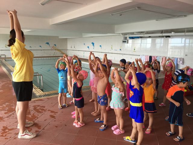 哇,戏水池好漂亮呀,真是太开心了!下水前我们跟着老师一起做做热身运动吧。