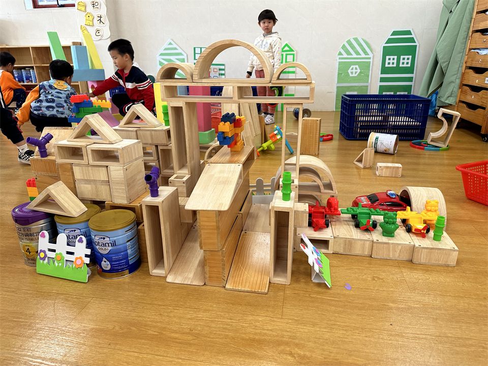 建构区,是小小建筑师的舞台。它满足了孩子们的建筑师梦想,他们搭建出高楼大厦、立交桥、美丽的家园……通过平铺、垒高、架空、延长、围合等技能提升幼儿各方面能力。