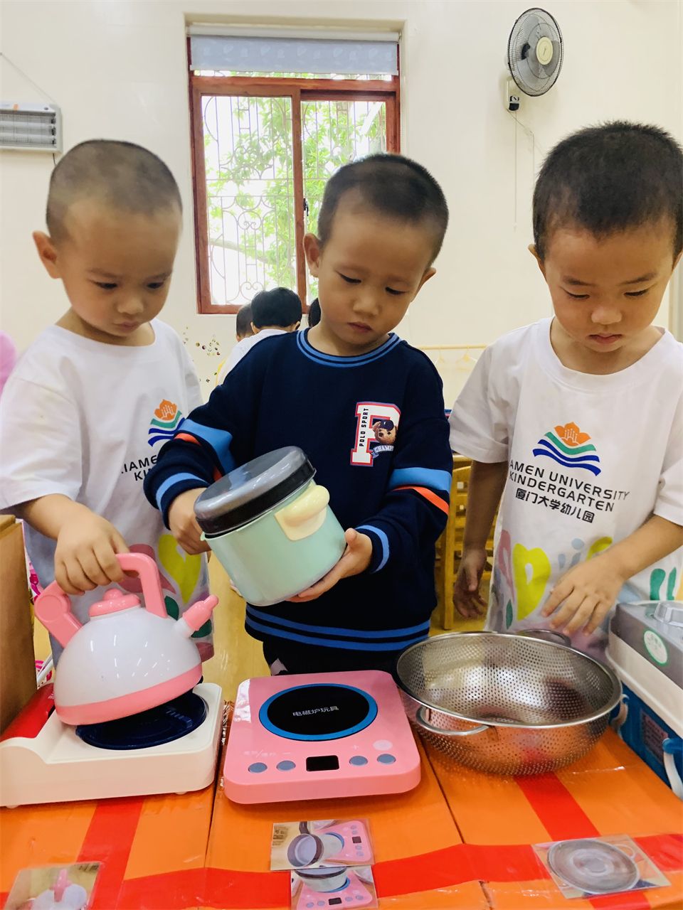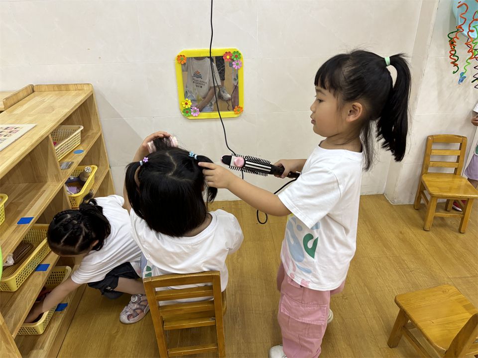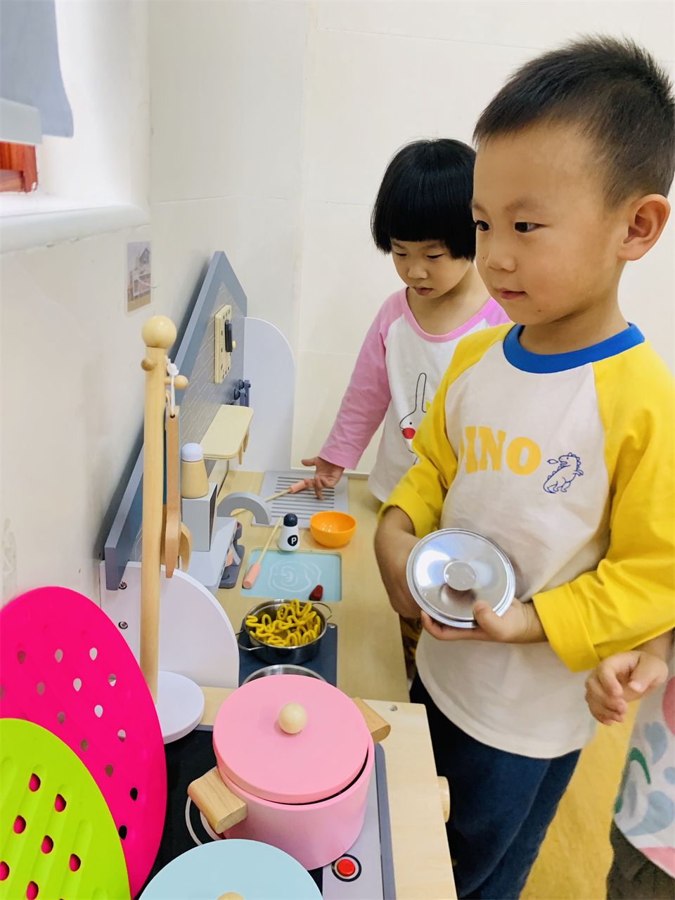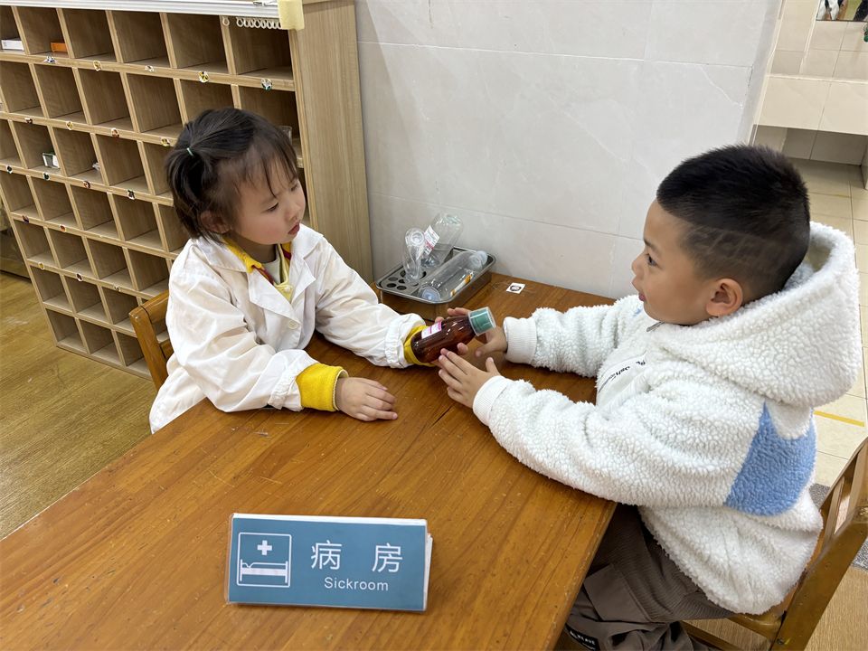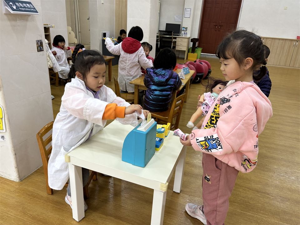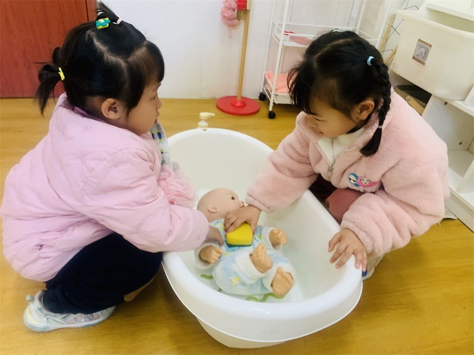 娃娃家里爸爸妈妈们精心照顾着宝宝,给宝宝洗澡、喂奶、哄睡。体会着爸爸妈妈的辛苦。
