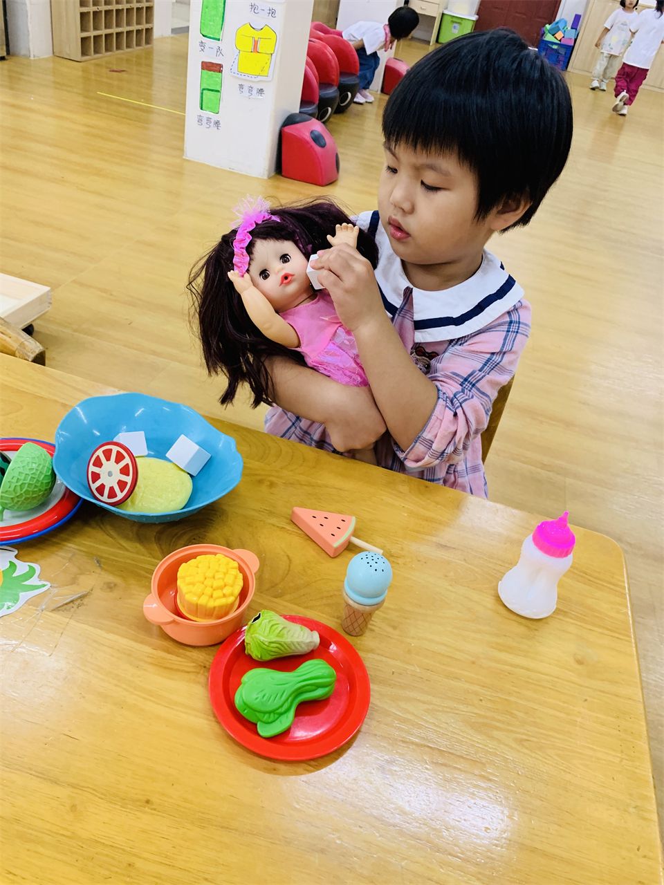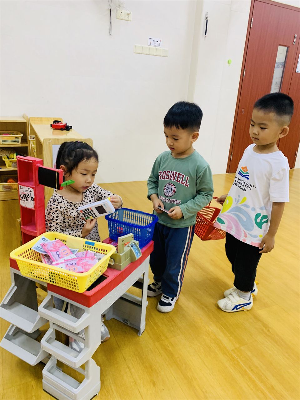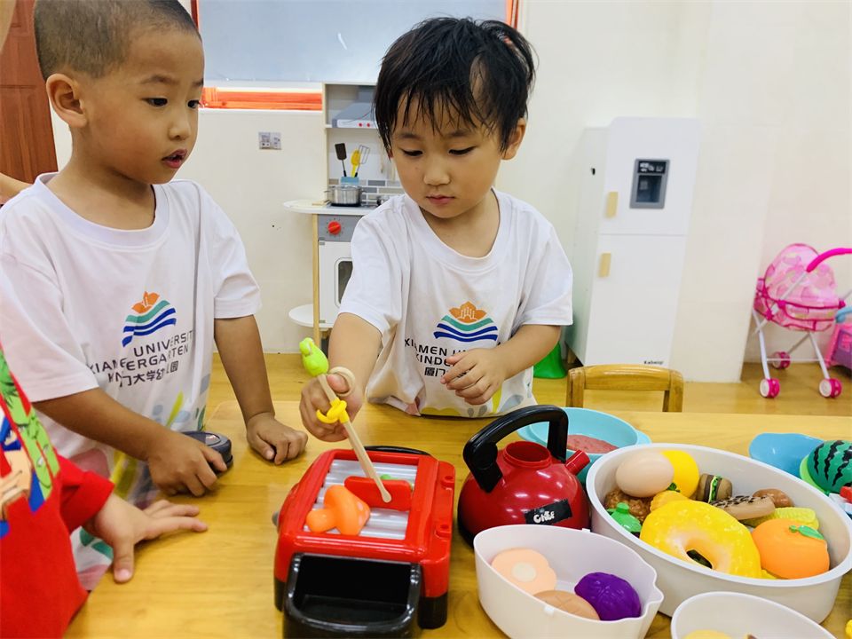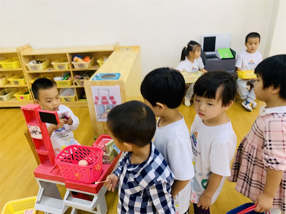 在角色游戏中,孩子通过扮演不同的角色,初步体验角色的责任和义务,学会和伙伴合作游戏,理解和遵守游戏规则。看,“娃娃家”的“爸爸妈妈”正在有模有样地做饭、喂娃娃、照顾娃娃;“超市”里也排着埋单的长龙,收费员忙碌地工作着。