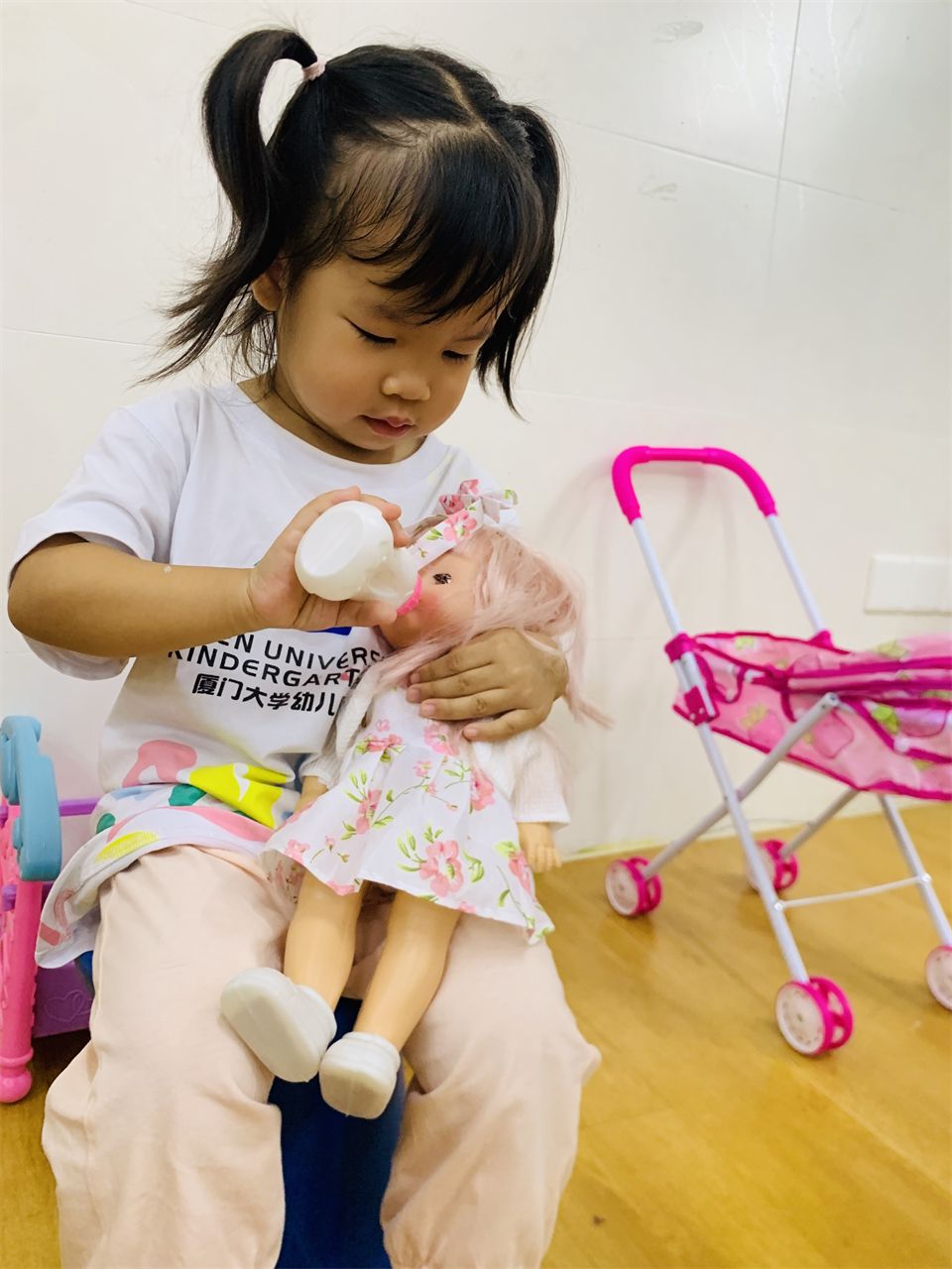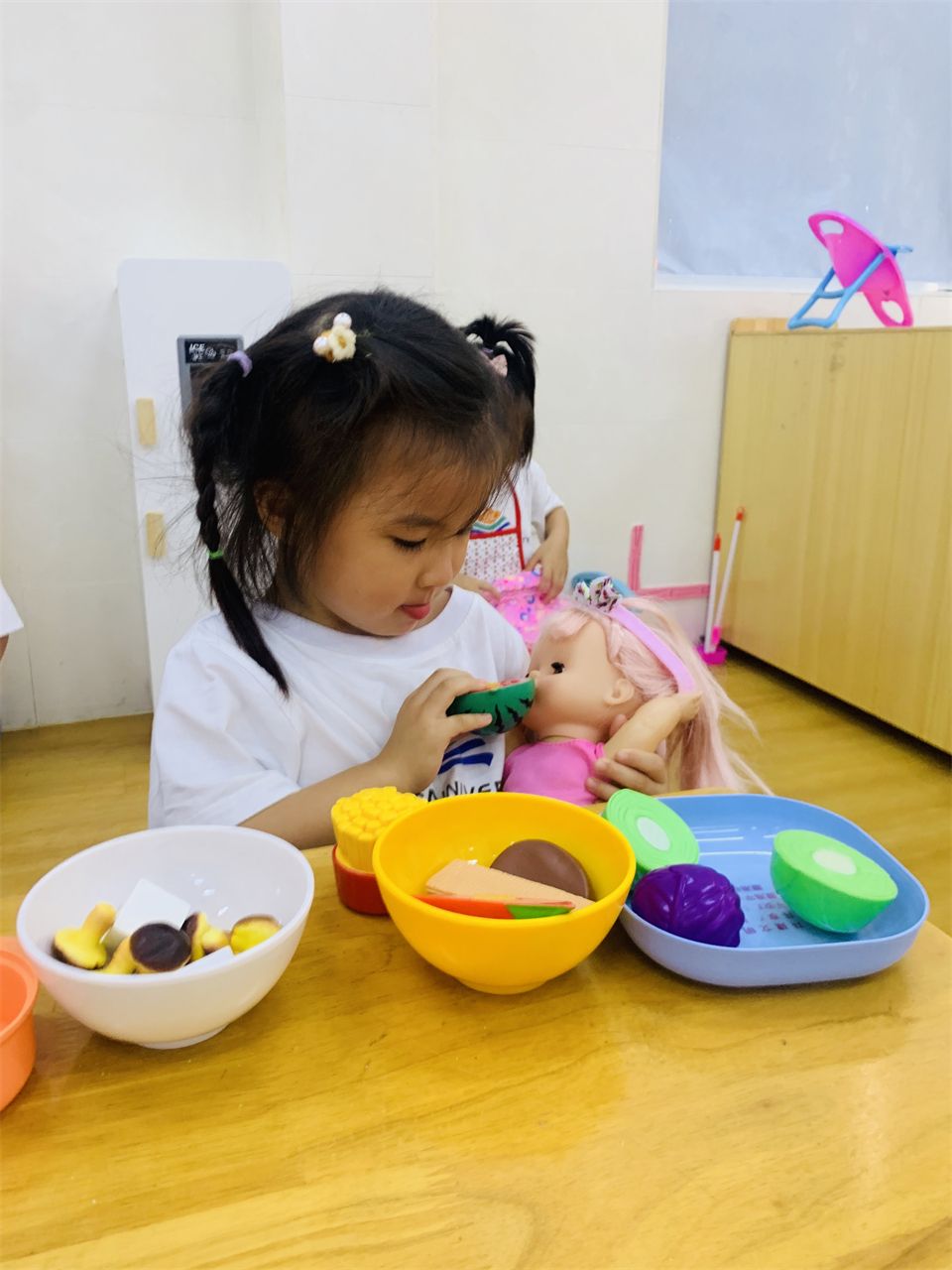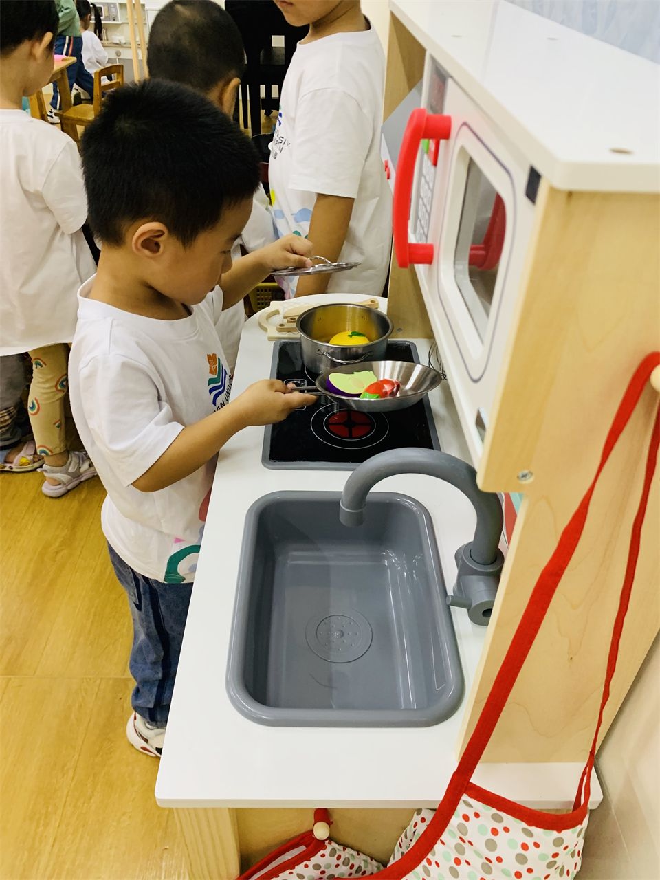 在角色游戏中,孩子通过扮演不同的角色,初步体验角色的责任和义务,学会和伙伴合作游戏,理解和遵守游戏规则。看,“娃娃家”的“爸爸妈妈”正在有模有样地做饭、喂娃娃、照顾娃娃;“超市”里也排着埋单的长龙,收费员忙碌地工作着。