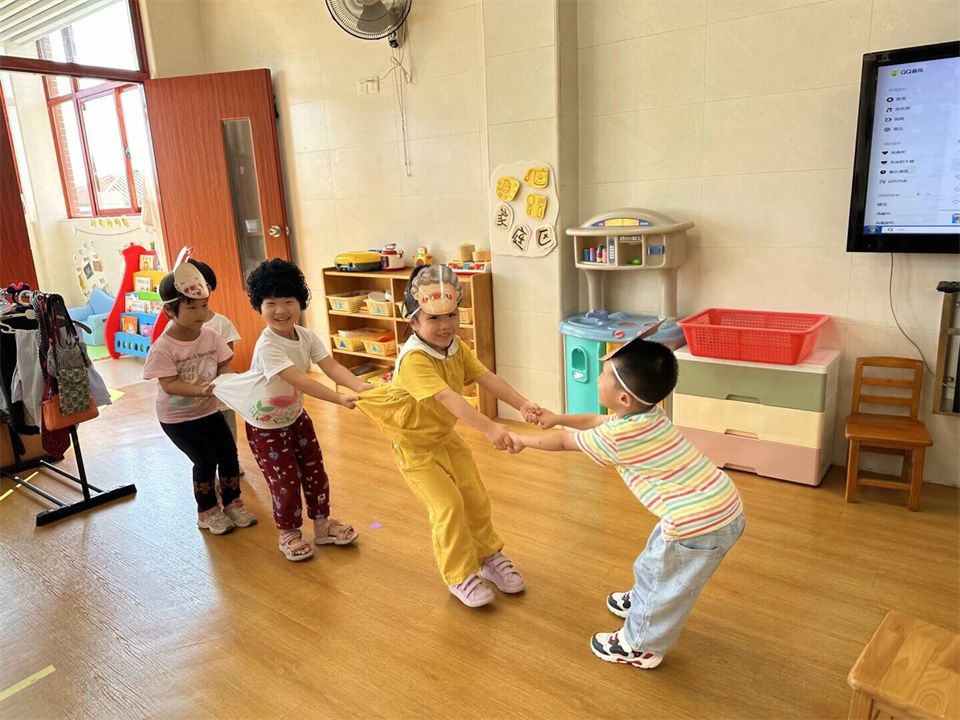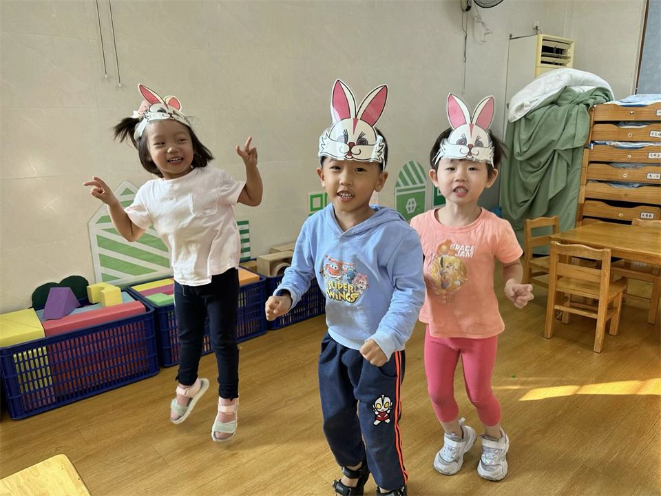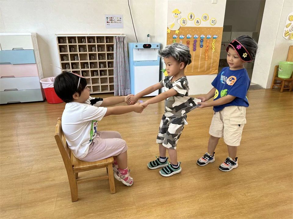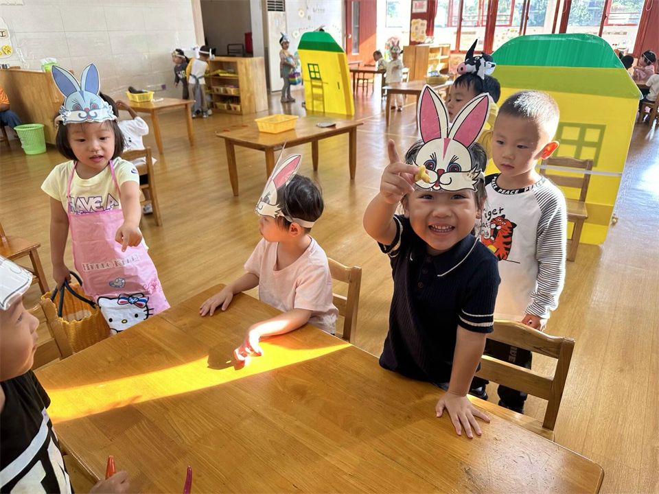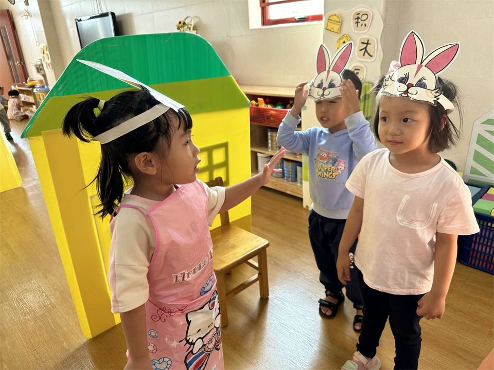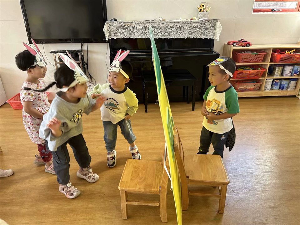 表演游戏中孩子们感受与同伴共同表演的乐趣,大胆用语言、动作和表情扮演角色的主要特征。看,《拔萝卜》的故事里,“老爷爷”带着大家正在唱着歌儿合作拔萝卜呢!哈哈,萝卜拔起来啦!《小兔子乖乖》里,凶狠的“大灰狼”用力敲着门,粗着嗓子唱着歌,兔宝宝们紧张地把门关得紧紧的……