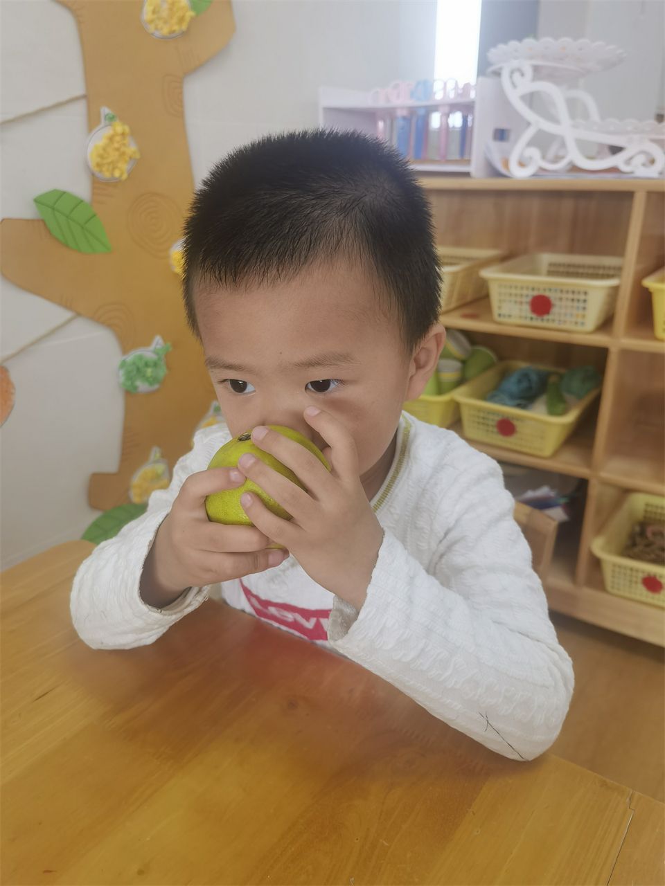 小五班的小朋友们下午吃水果品尝橘子时,边吃边聊起关于橘子的话题。