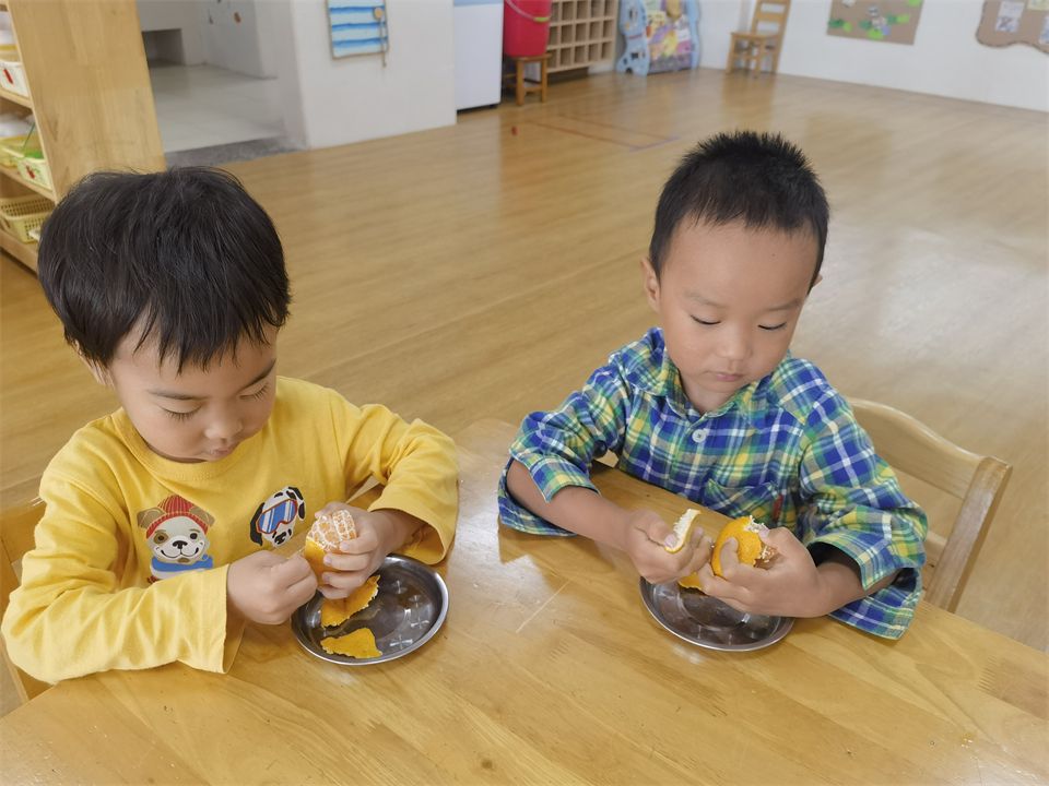 剥一剥,“瞄准肚脐眼,用手抠个洞,沿着橘子皮,外衣剥下来!”小朋友们都学会了自己剥橘子。
