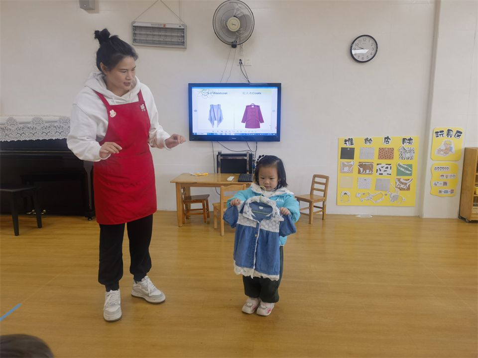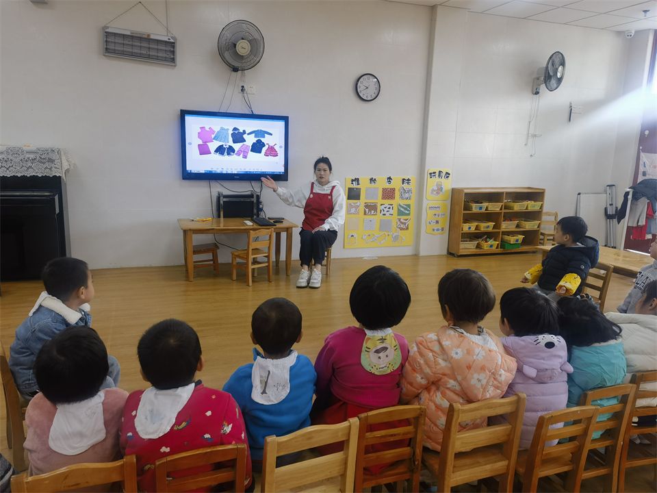 小朋友通过观看图片,分享自己带来的衣服,简单了解了衣服的结构和种类。