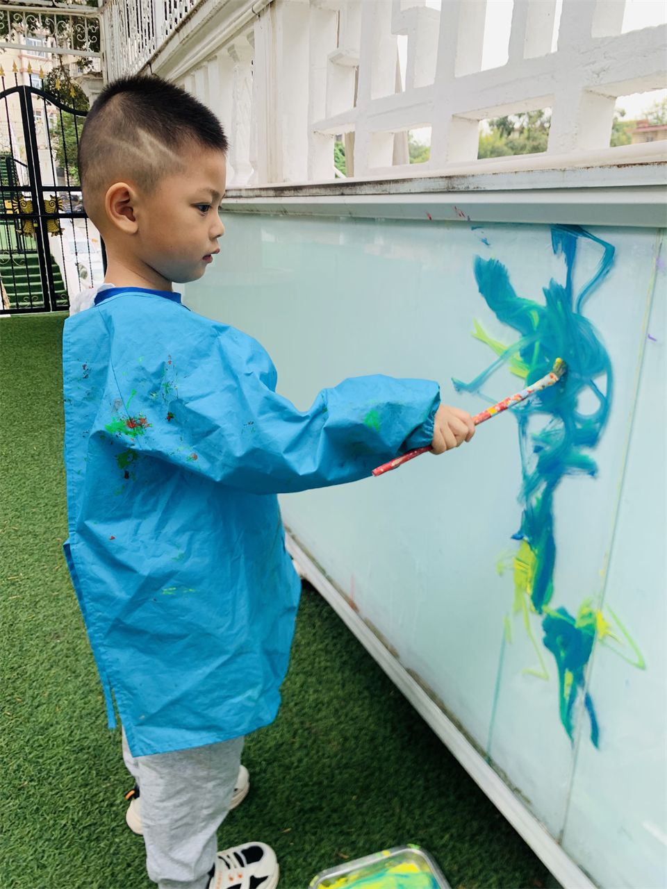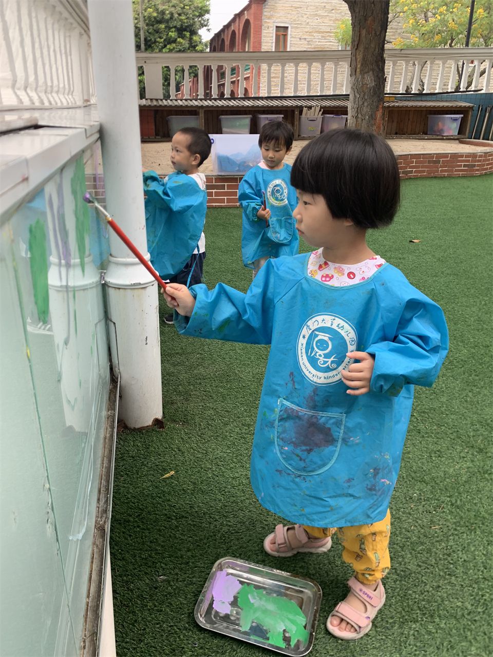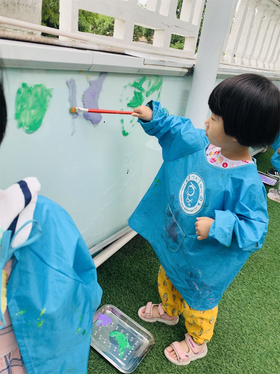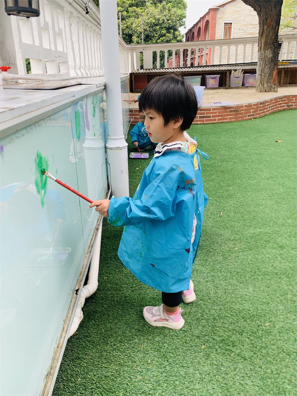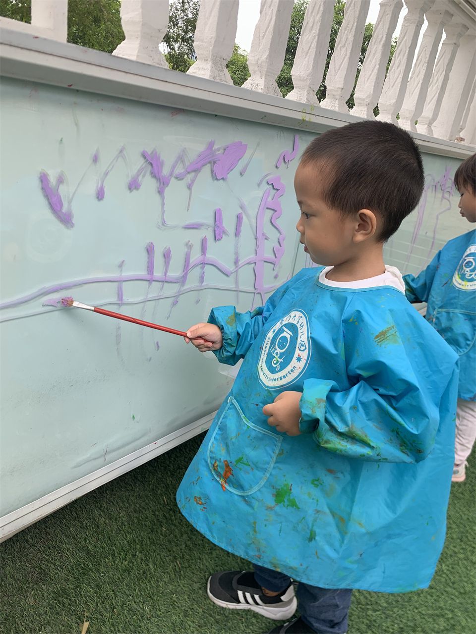 涂鸦区的宝贝们,穿着围裙、手里拿着排笔、蘸上水彩,有模有样地在涂鸦墙上画着,就像一个个小画家。