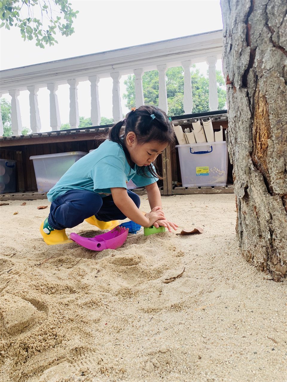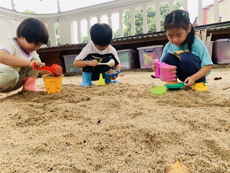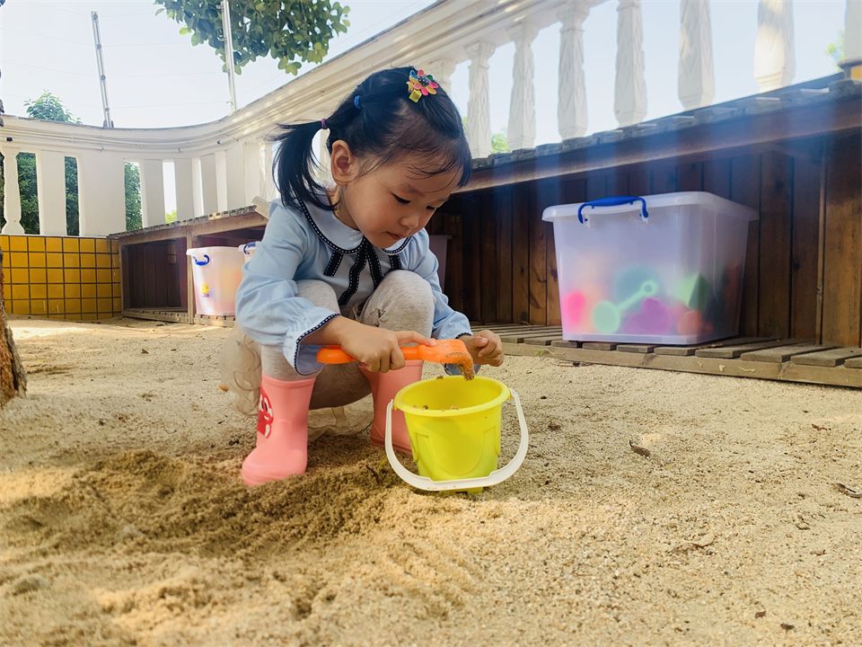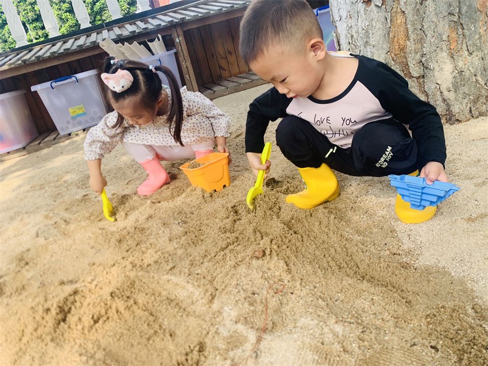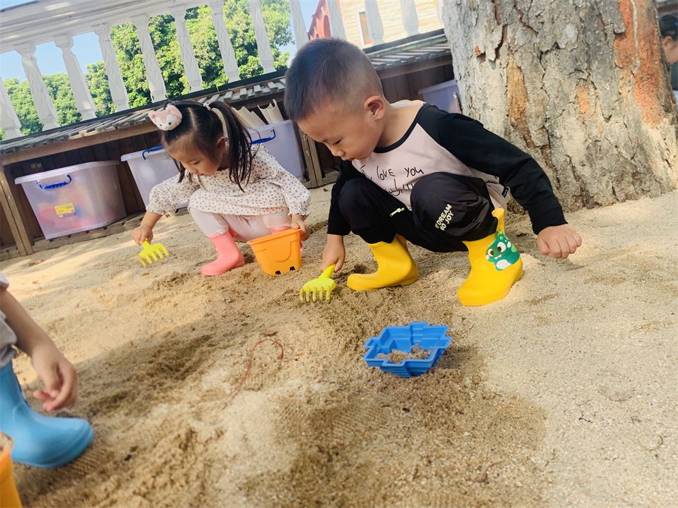 菠萝蜜果树下的沙池里,小一班萌娃全副武装:雨靴、围裙、小铲、小挖勺、小桶……玩沙游戏进行时:“老师,挖沙真好玩,我明天还想来!”。
