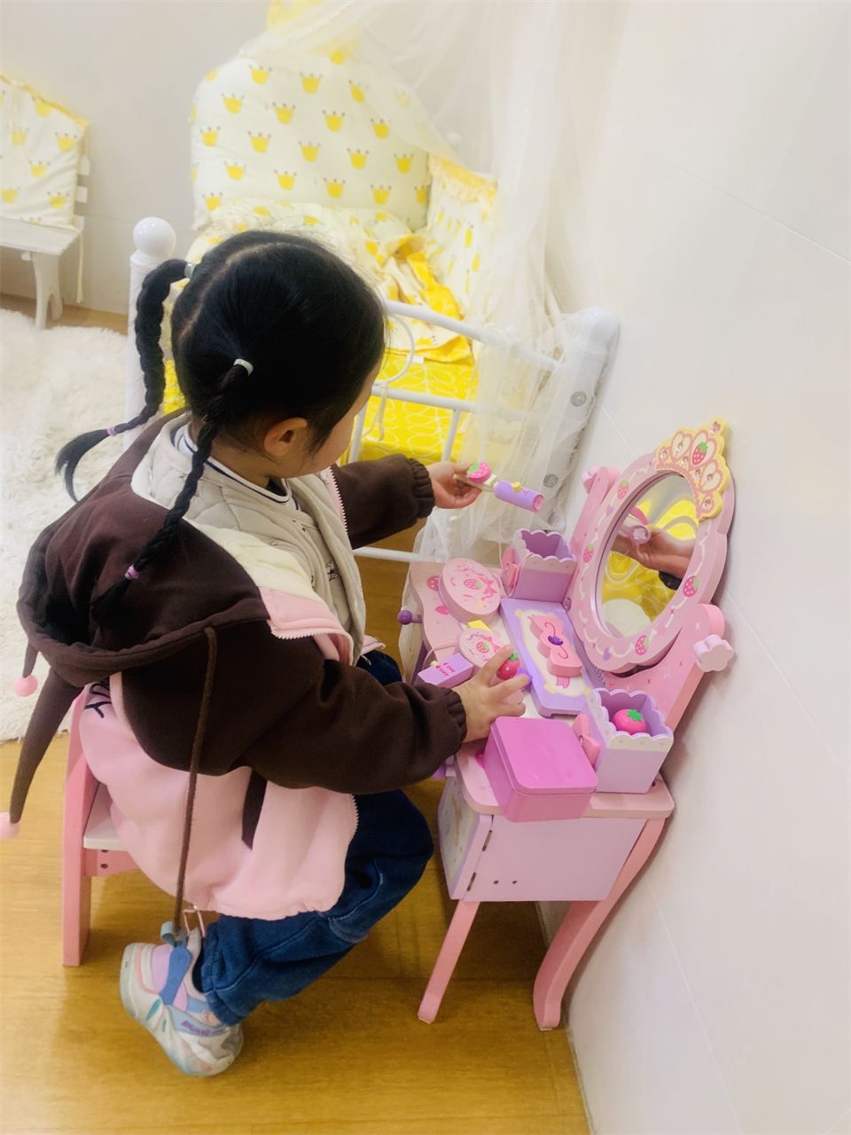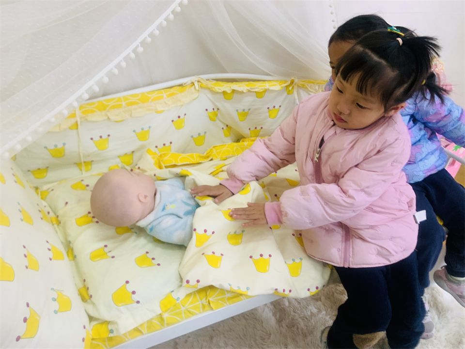 在生活坊里,各种精美仿真的家具、厨具、生活玩具让孩子们爱不释手,我当爸爸、你当妈妈,我们一起照顾宝宝,我做饭、你给宝宝洗澡……孩子们的游戏来源于生活,生活坊里的萌娃们玩得舍不得离开呢!
