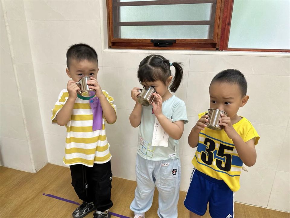 我们小朋友喝水的时候不可以说话、乱跑,要踩在线上哦。