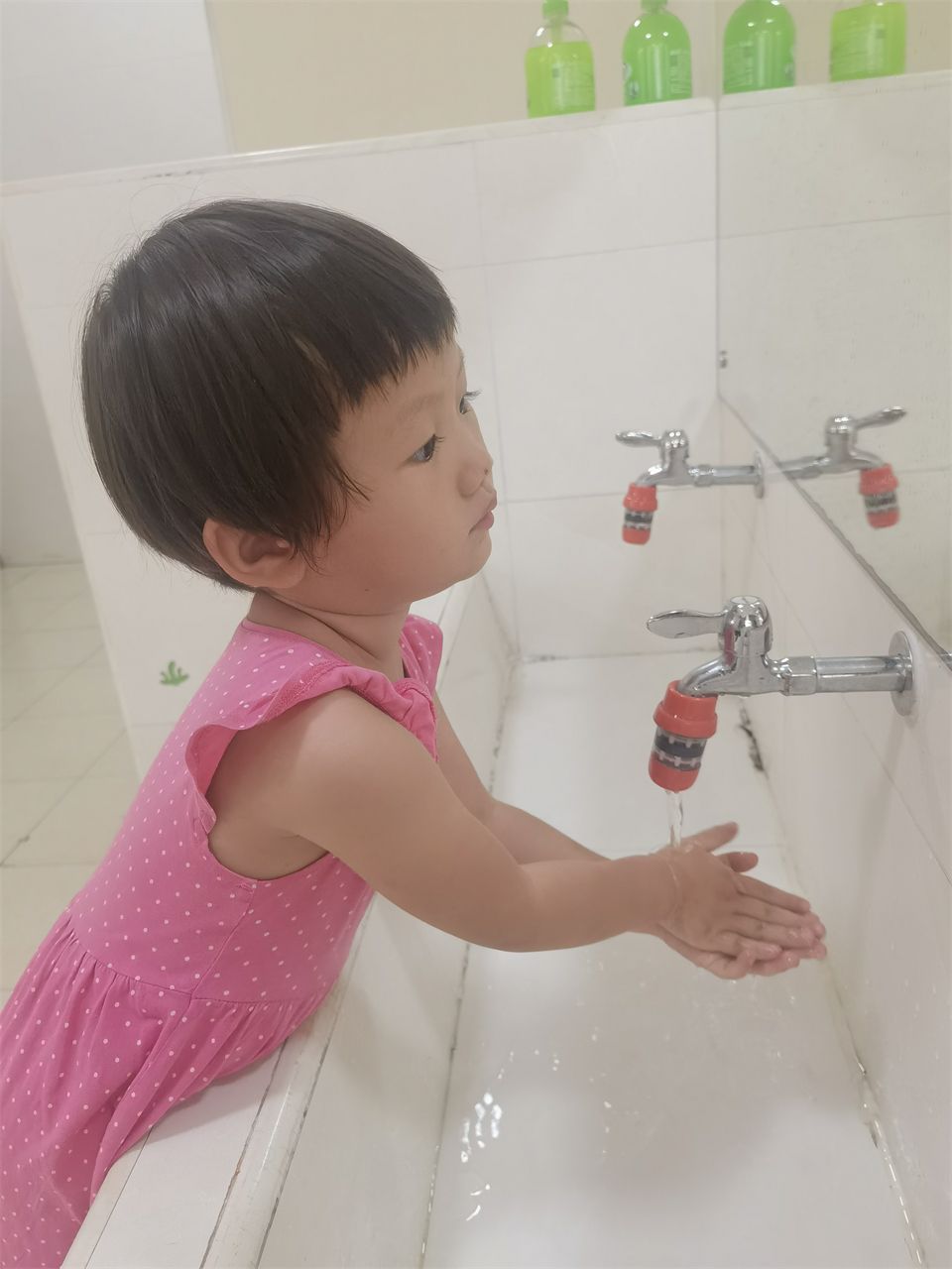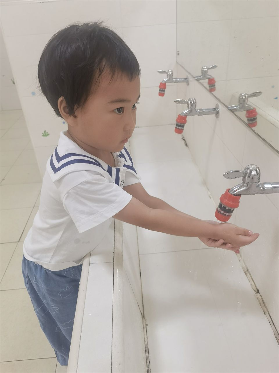 上完厕所一定要洗手的,老师看看我棒不棒,水龙头都是我自己开的。