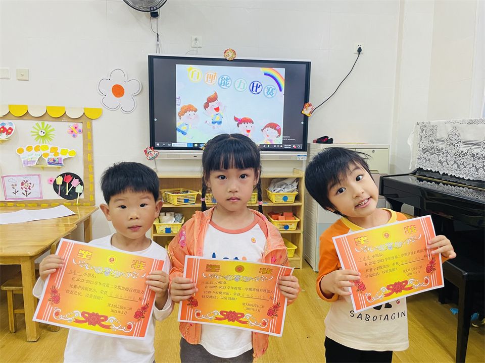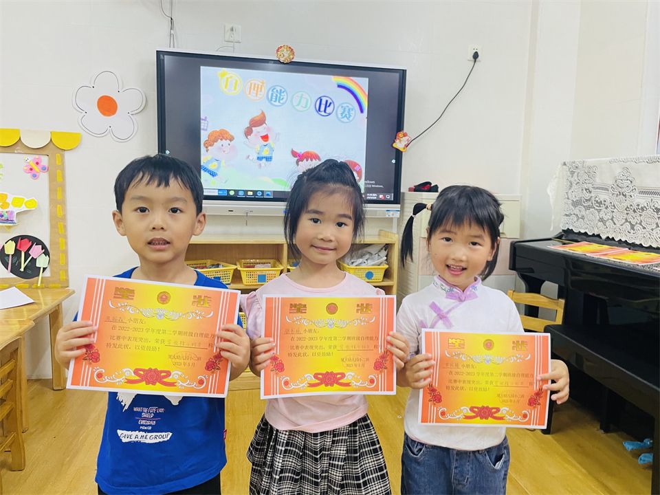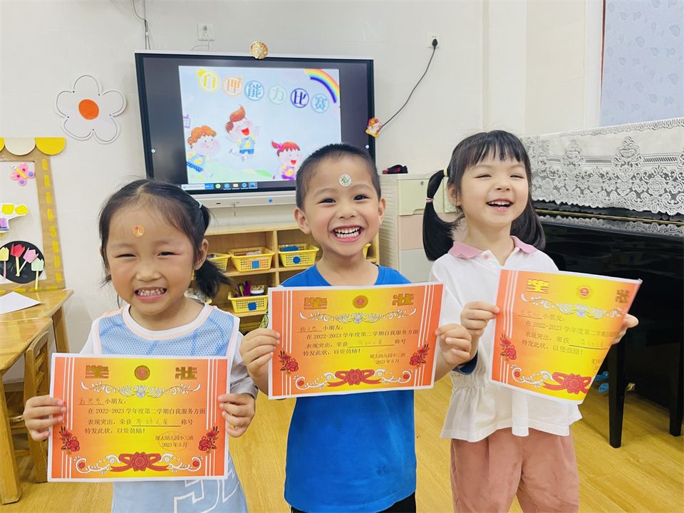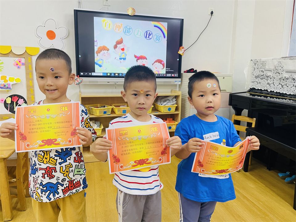经过萌娃们的努力,大家都完成了挑战,让我们一起见证荣誉时刻的到来。看,这些能干宝贝脸上扬起灿烂的笑容,手上拿着属于他们的荣誉,小身手大能力,自信自立的你们值得最棒的掌声!