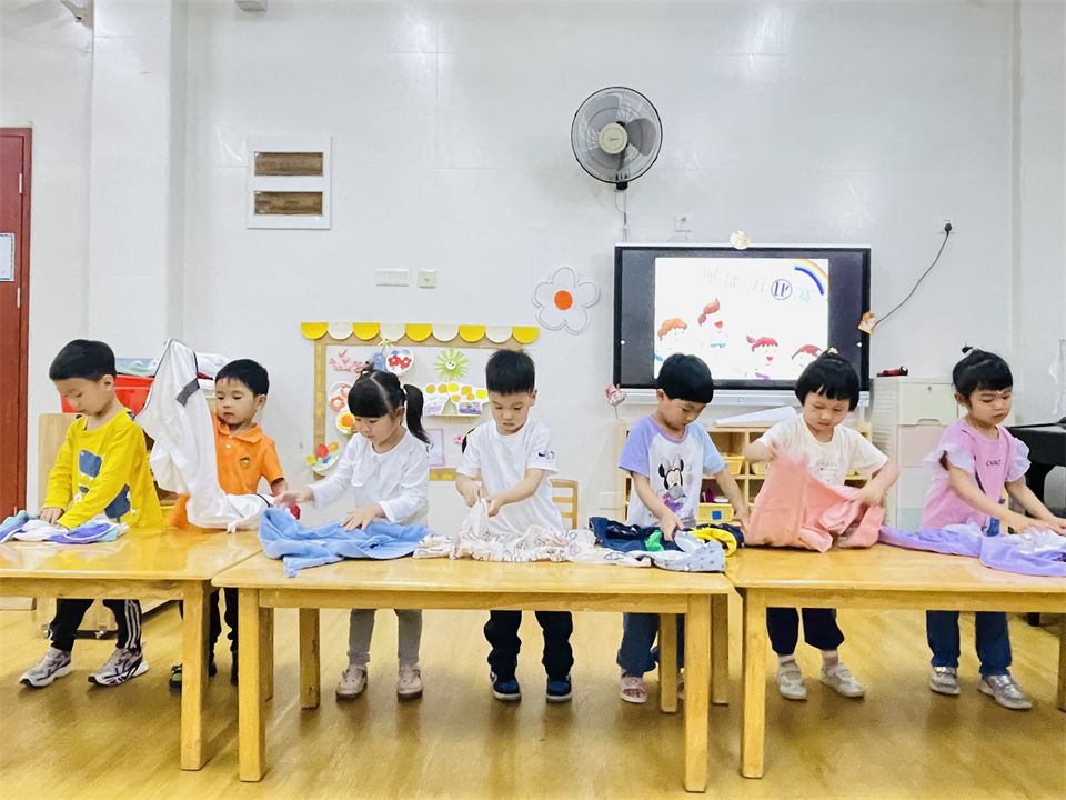 结合“劳动节”的教育契机,我们还开展了自理能力大比拼的比赛,提高幼儿的自我服务意识。