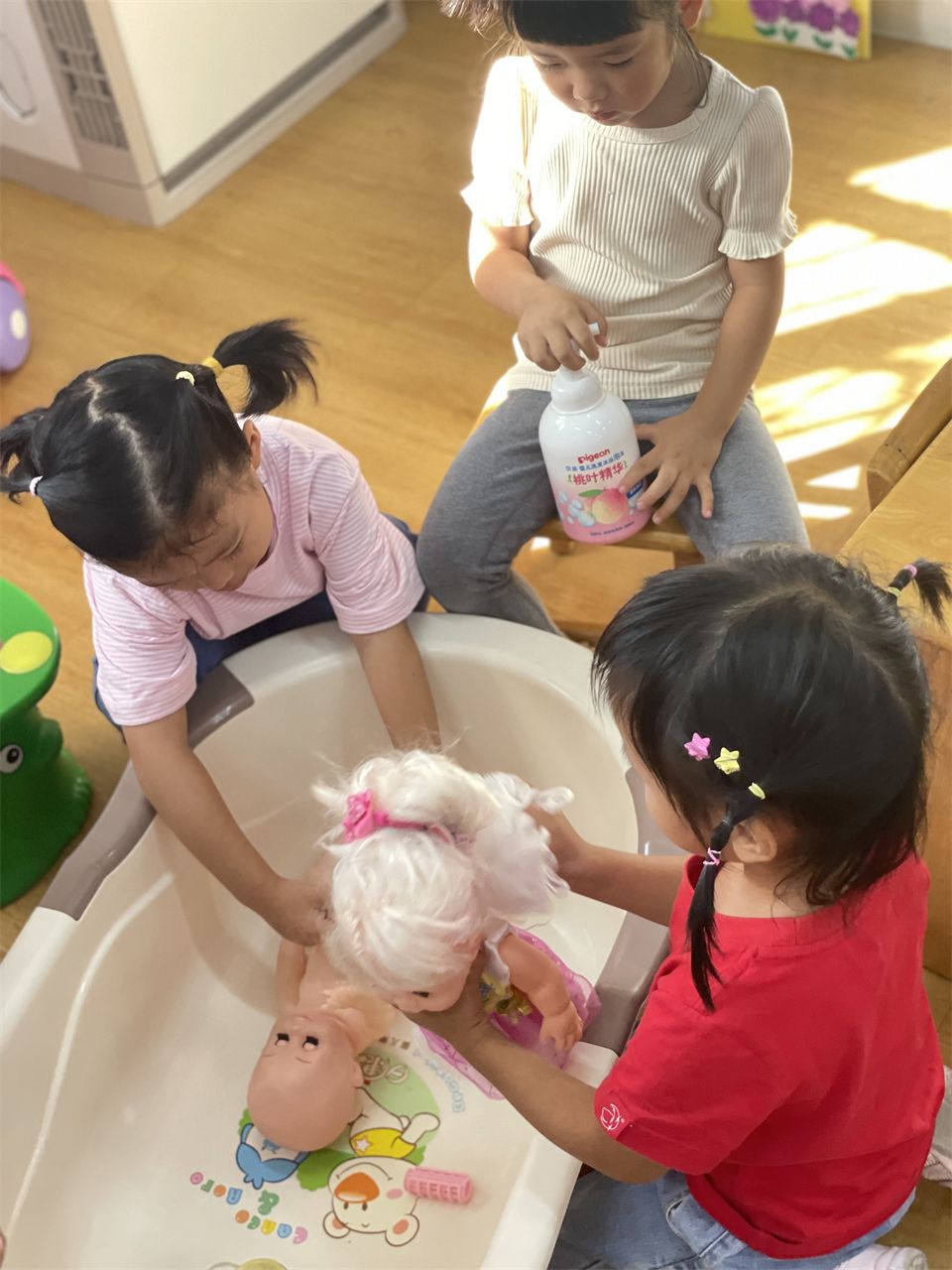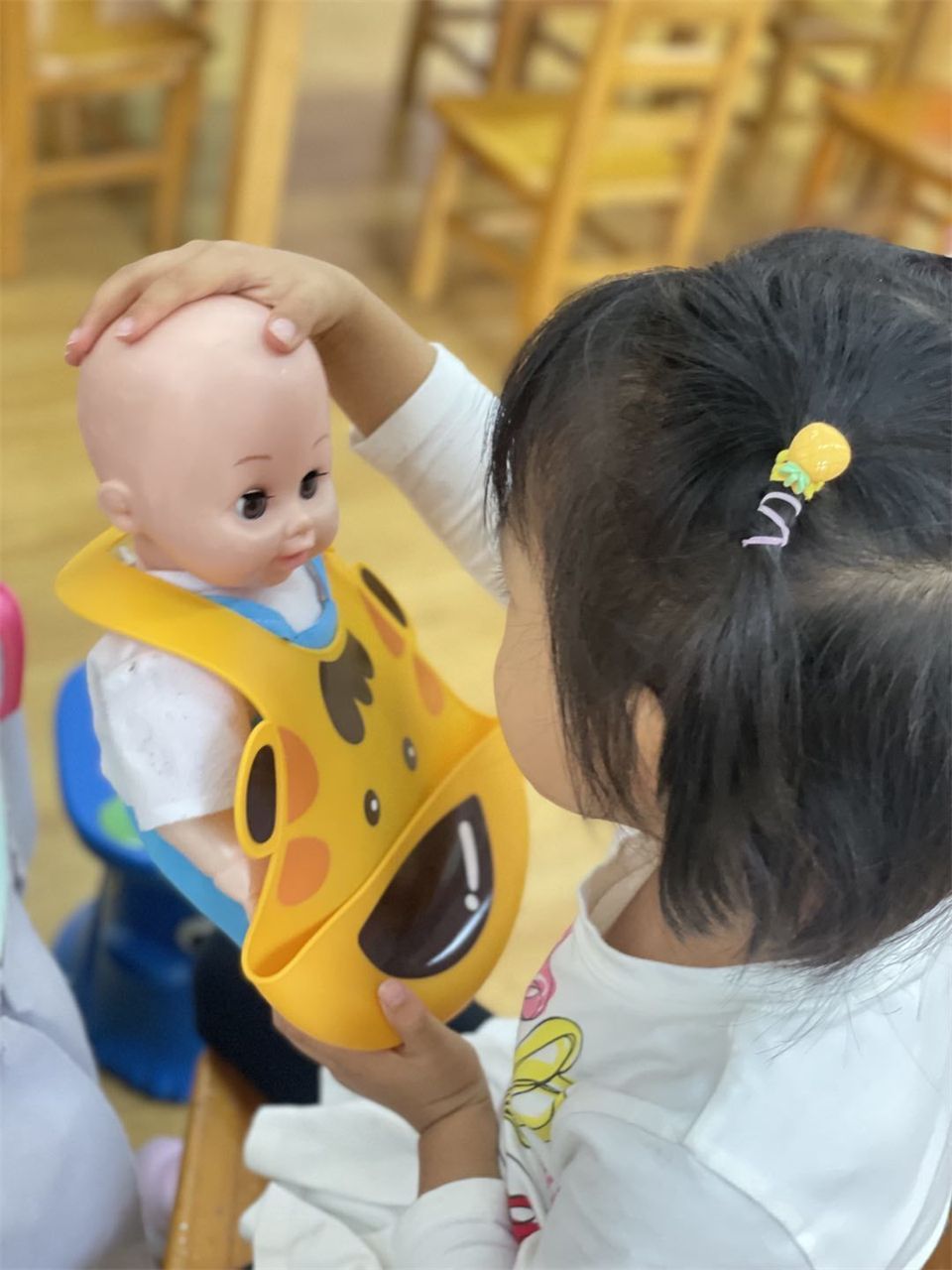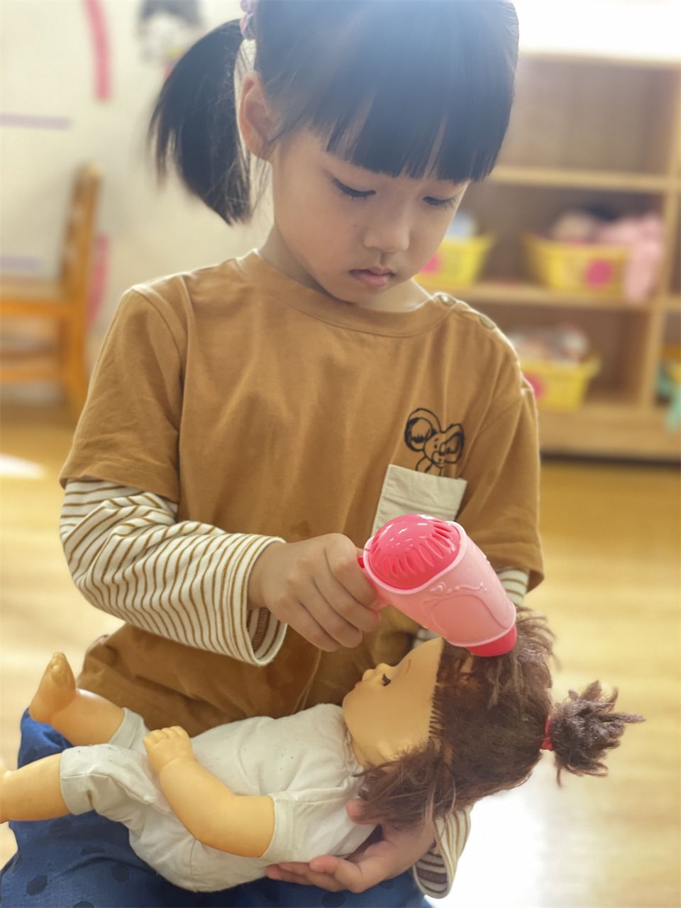 家庭区的娃娃家,萌娃们都变成了贴心的“爸爸妈妈”在给宝宝洗澡洗头,小瑶在给宝宝喂奶,小钧再给宝宝吹头发,小语瑶瑶在扫地做家务…把宝宝照顾的棒棒的!