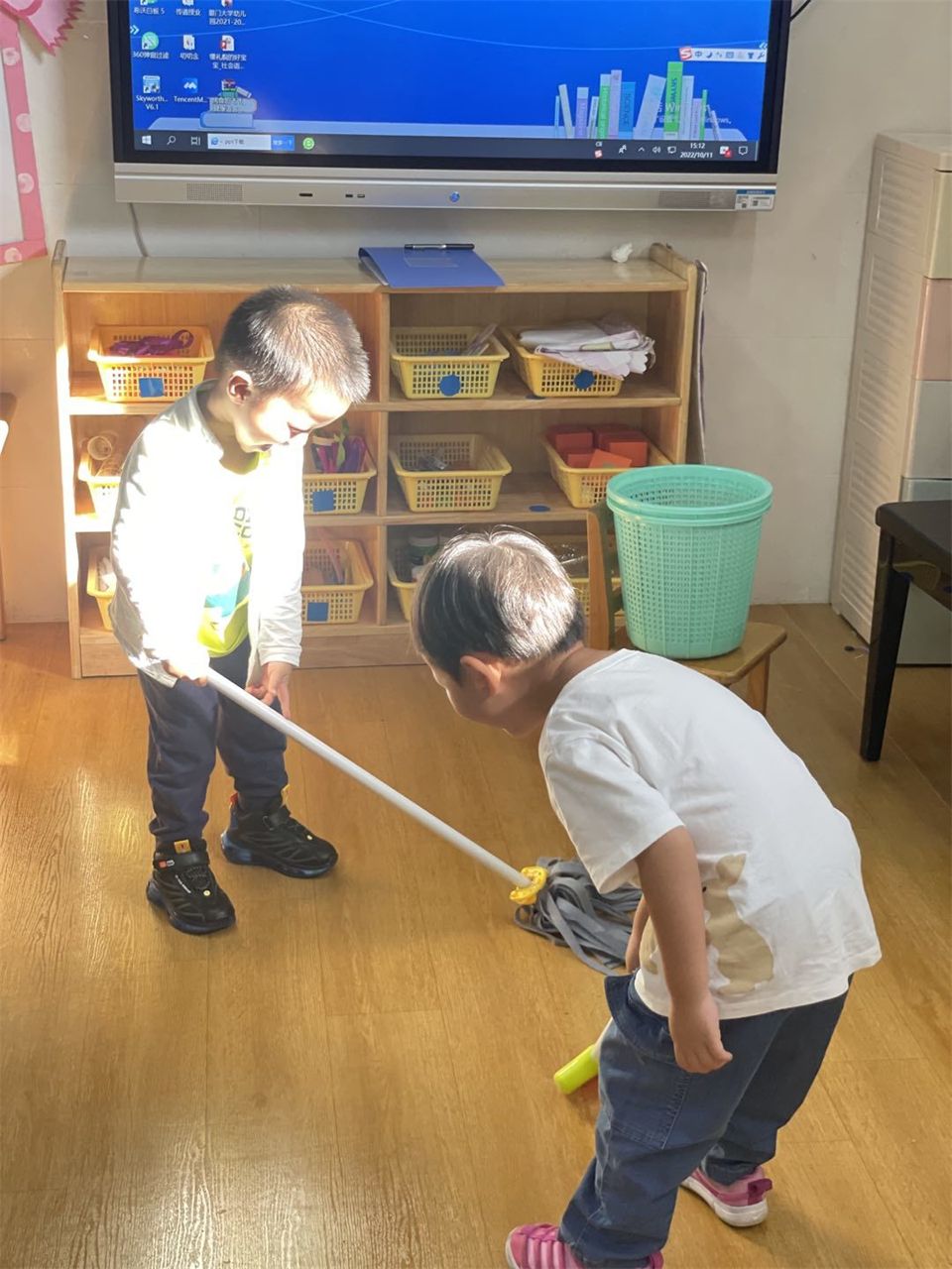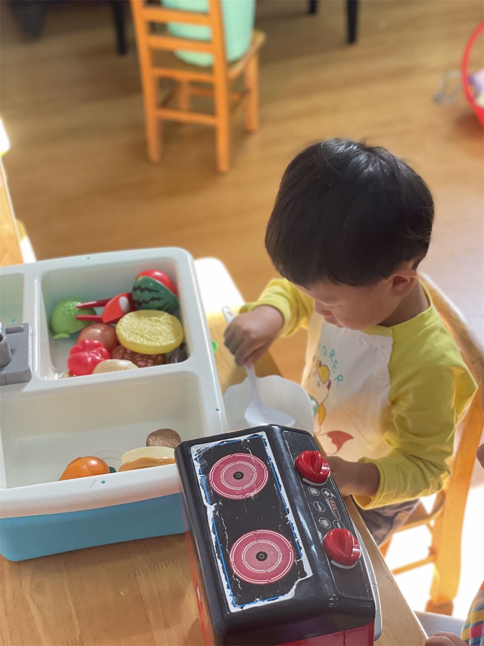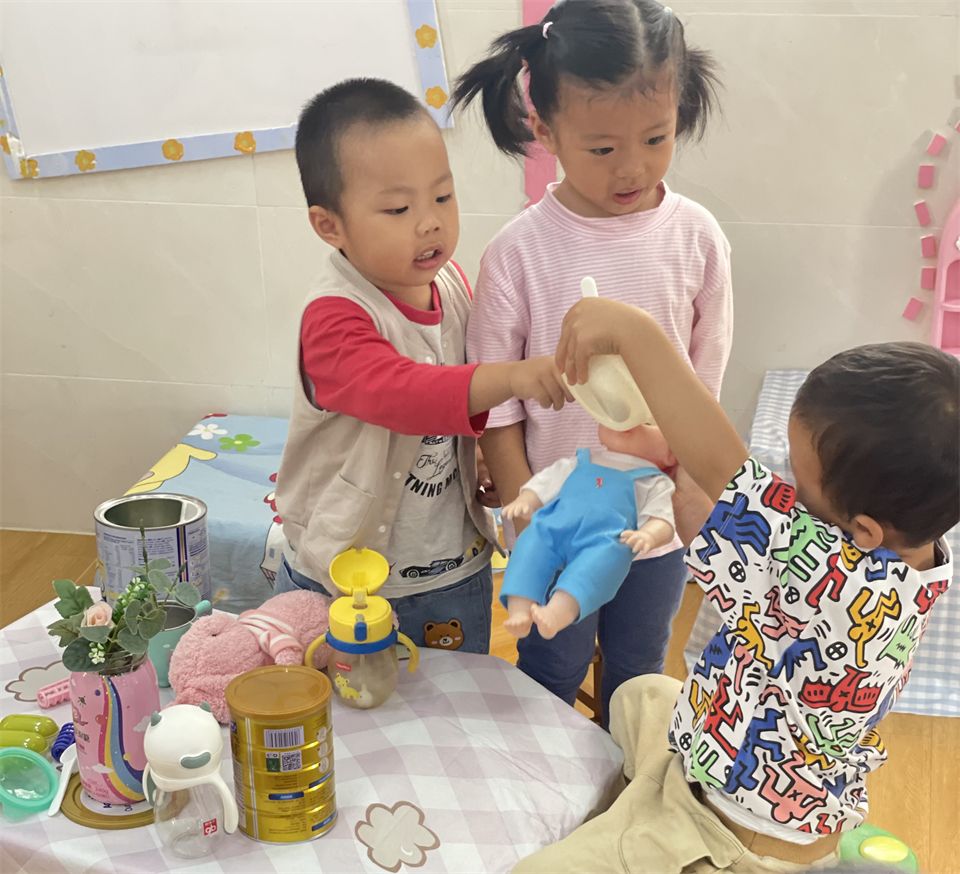 家庭区的娃娃家,萌娃们都变成了贴心的“爸爸妈妈”在给宝宝洗澡洗头,小瑶在给宝宝喂奶,小钧再给宝宝吹头发,小语瑶瑶在扫地做家务…把宝宝照顾的棒棒的!