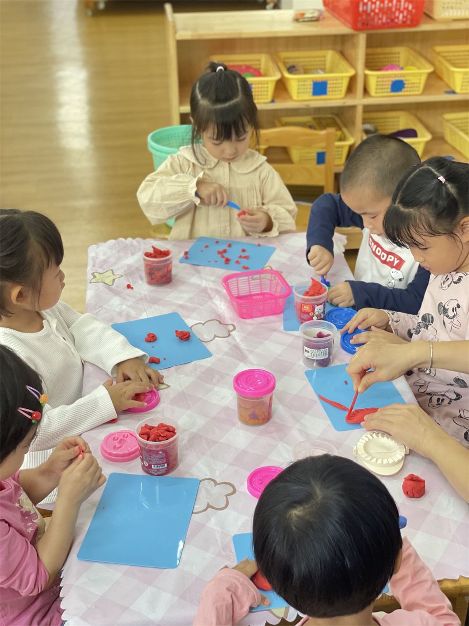 我们的艺术区,小小艺术家们用不同颜色的橡皮泥在做“香甜可口的草莓”,“肉馅满满的饺子”,还有的在画“美味诱人的糖葫芦”,萌娃们可太会做啦。