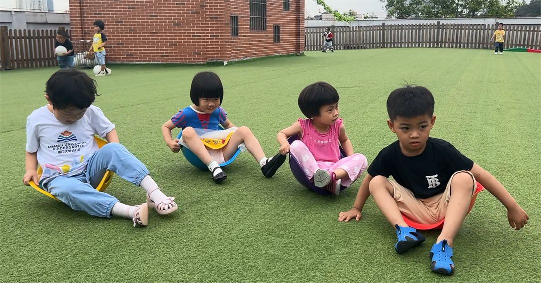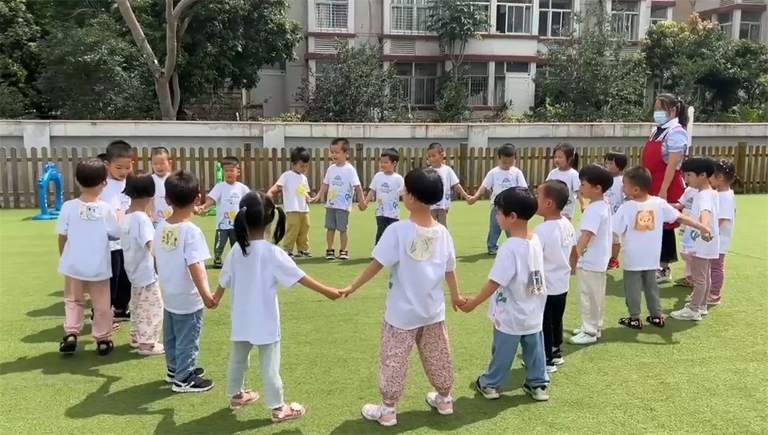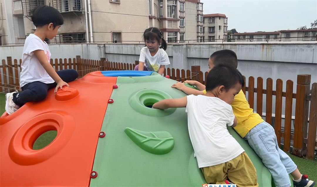 天晴了,小朋友户外积极参加集体游戏,户外场所变成了他们的游乐场。